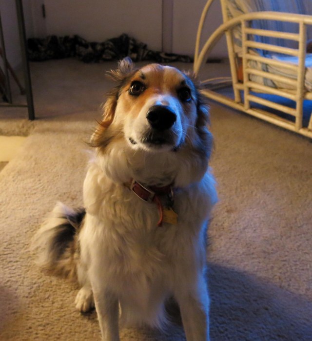Here I am in a characteristic pose. Okay, really not hugely characteristic, because I’m being ultra serious and super good. The guy I live with took my picture, but before he did that, he said “Sit“. And this is the result.