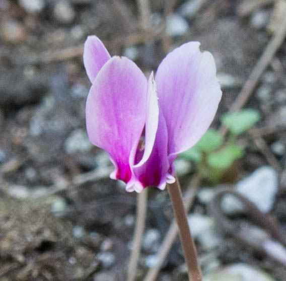 The bit of green rabbit wire in the lower left is because of the cyclamen which were planted there a little while ago, and in fact, it’s not to prevent me from stepping on them, but to remind the guy I live with that cyclamen were planted. They’re Cyclamen hederifolium and a couple are flowering now.