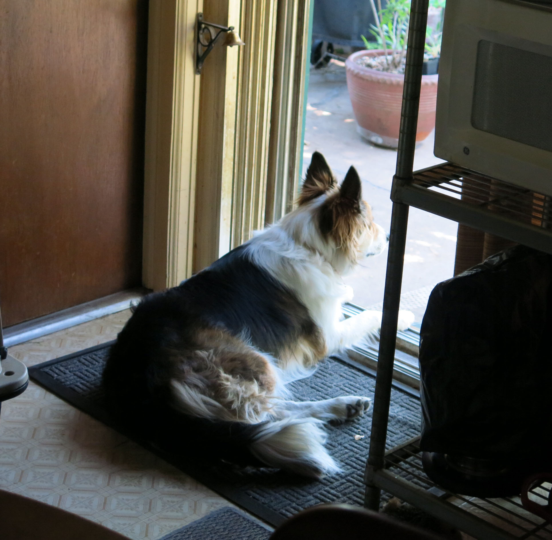 This is me (if you didn’t know). By the way, I suppose I’ve said this before, the bell was put up for purebred border collies who lived here before me so that they could ring the bell if they wanted to go out. They really did that. But the back door has been left open (except at night) for the last eight years, so I don’t have to ring the bell when I want to go out. I just go.
