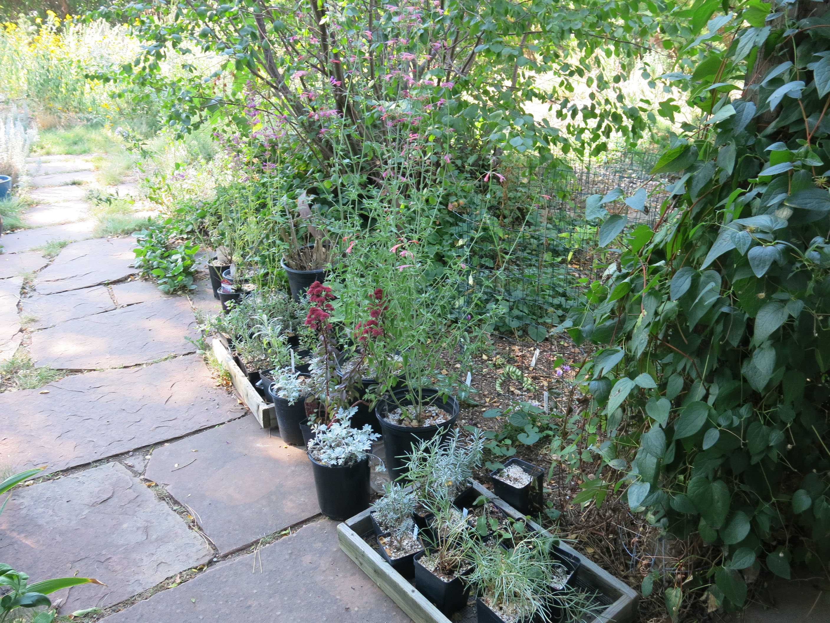 The plants are being watered every day. They like that. Even when planted in the garden they need a lot more water than some people say they do; they get lots of rain from the monsoon in their native habitat. They’re usually grown here with drip irrigation or lots of watering. Neither of those things is going to happen here, of course. In fact these have been grown here before, and died of drought.
