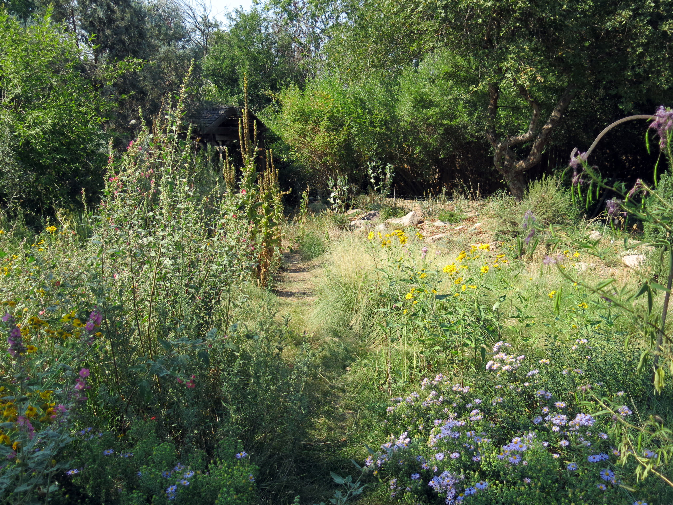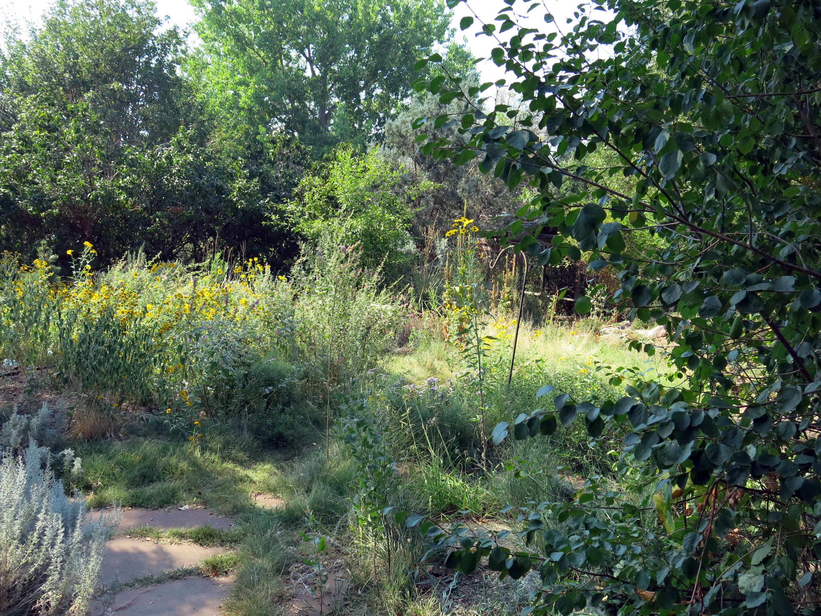 Anyway …it’s been extremely dry here. The guy I live with watered almost the whole garden last week (not the front yard, which never gets watered), because the plants were looking distressed. They look better now. (The pole, which used to hold a solar lamp, does need to be straightened; I’ll mention that to you know who, tomorrow.)