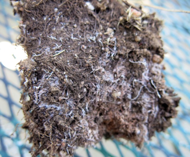 Then a plant of Salvia greggii, which wilted every single day, was dug up and given the once-over. The root ball was mostly peat moss, dry and hard as a rock.
