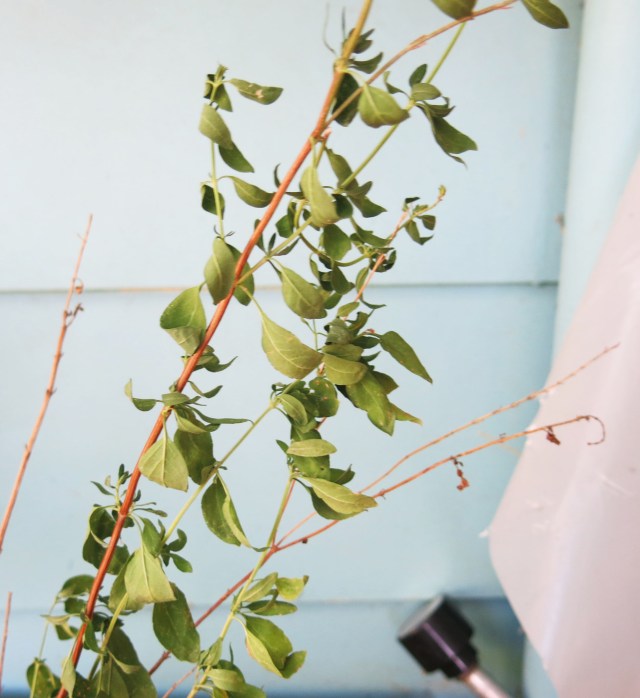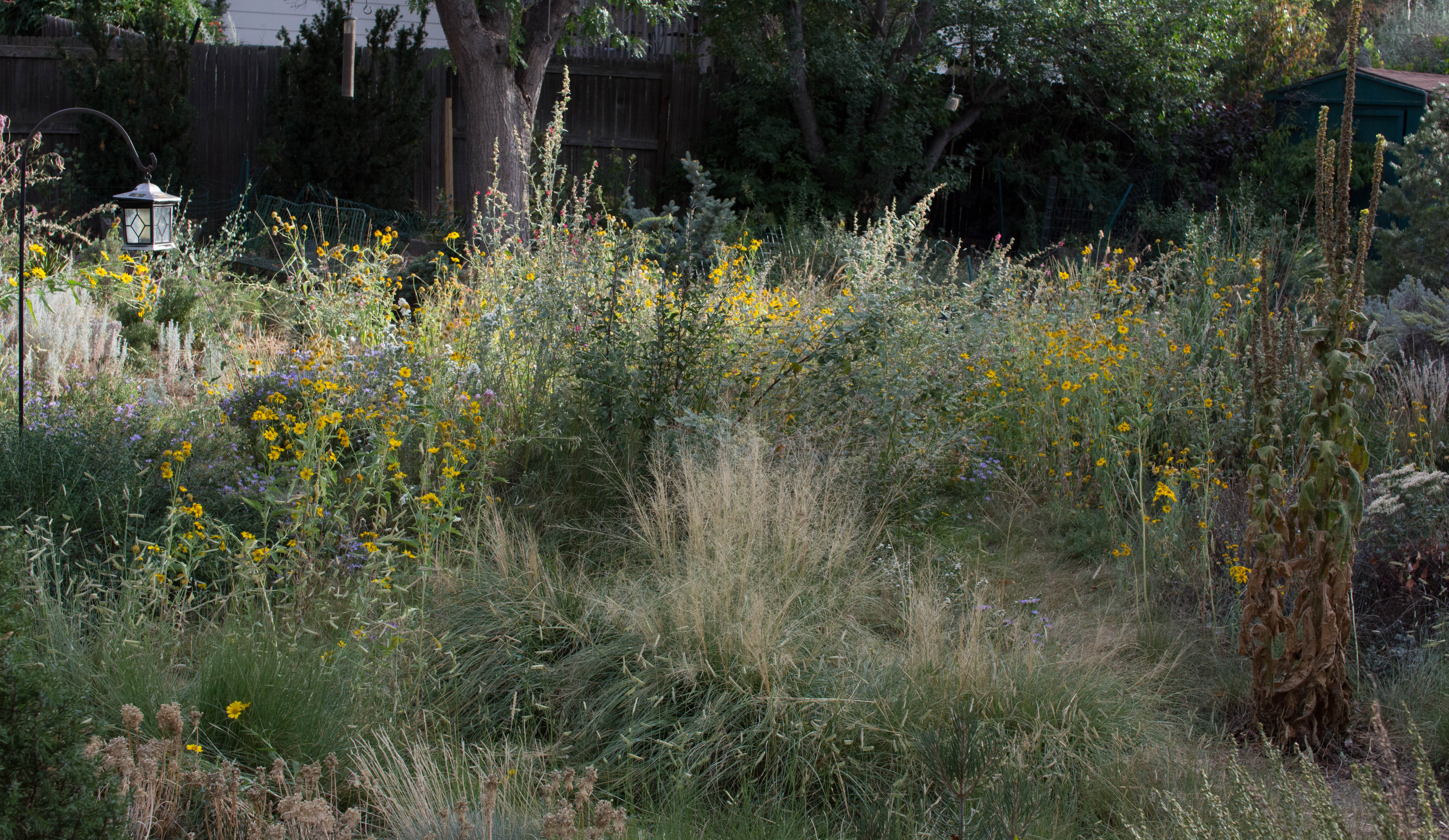 The rain wasn’t enough to perk up all the cow-pen daisies growing in what used to be a lawn, but is just now a bunch of plants. I guess, if you’re the kind of person that notices things, like I certainly am, you’ll notice the solar lantern is back on its post. It doesn’t work. The post looked dumb with nothing hanging from it. The guy I live with said the solar panels were “shot”. The plastic covering on the little panels wore away over the years and now the sun can’t recharge the batteries in the lamp. So it’s just there, the way so many things here are. The mulleins, on the right, definitely need to be cut down. They’re Verbascum densiflorum, if you were wondering.