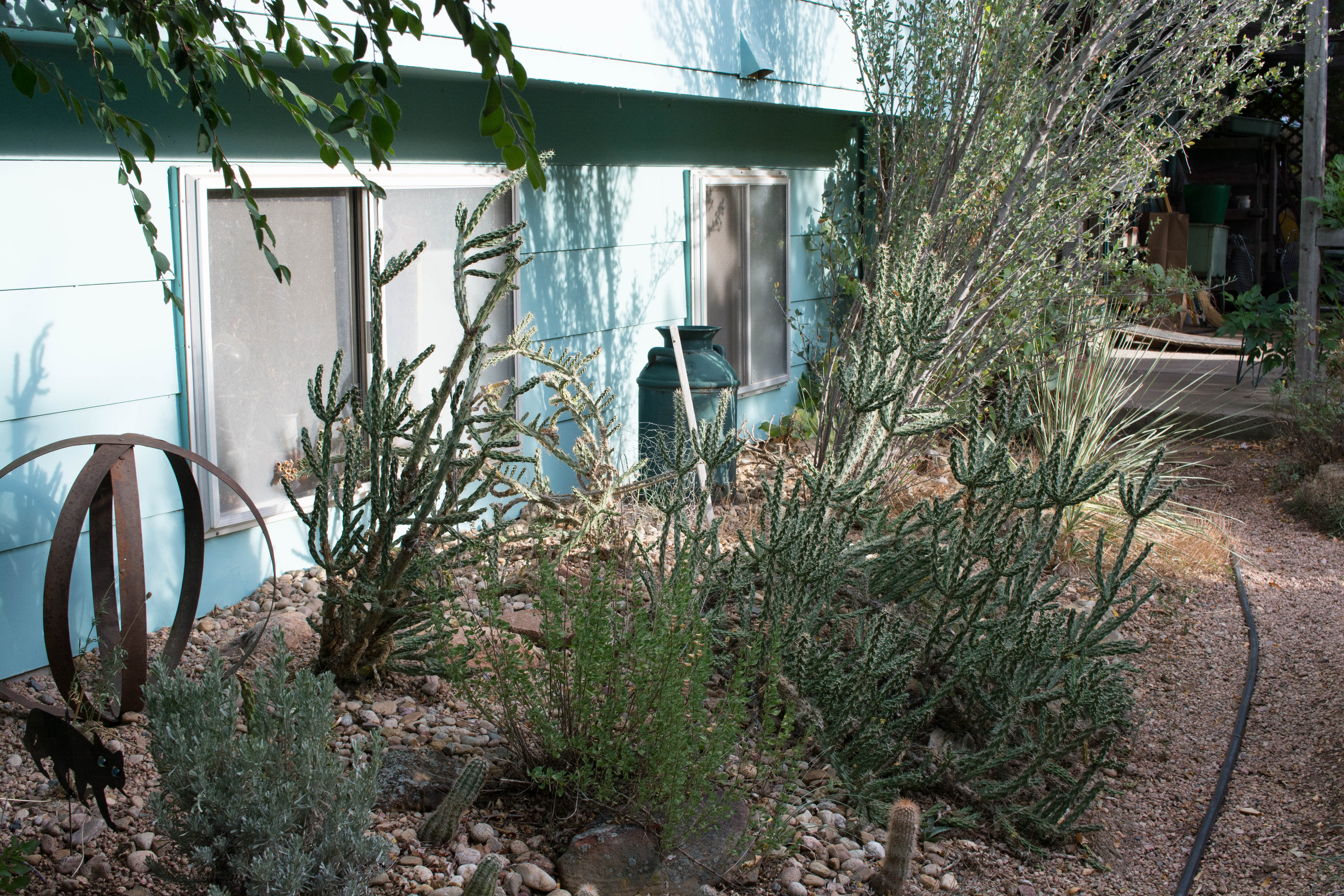 It was repotted, and the rather minimalist border on the west side of the house, where it was growing (and wilting) was spruced up, some. The milk can was moved from the north border. I think it looks better here. The French scare cat in the lower left is just there because it isn’t anywhere else. That’s a big, non-wilting Salvia greggii in the lower center. It isn’t flowering because it’s been so dry.