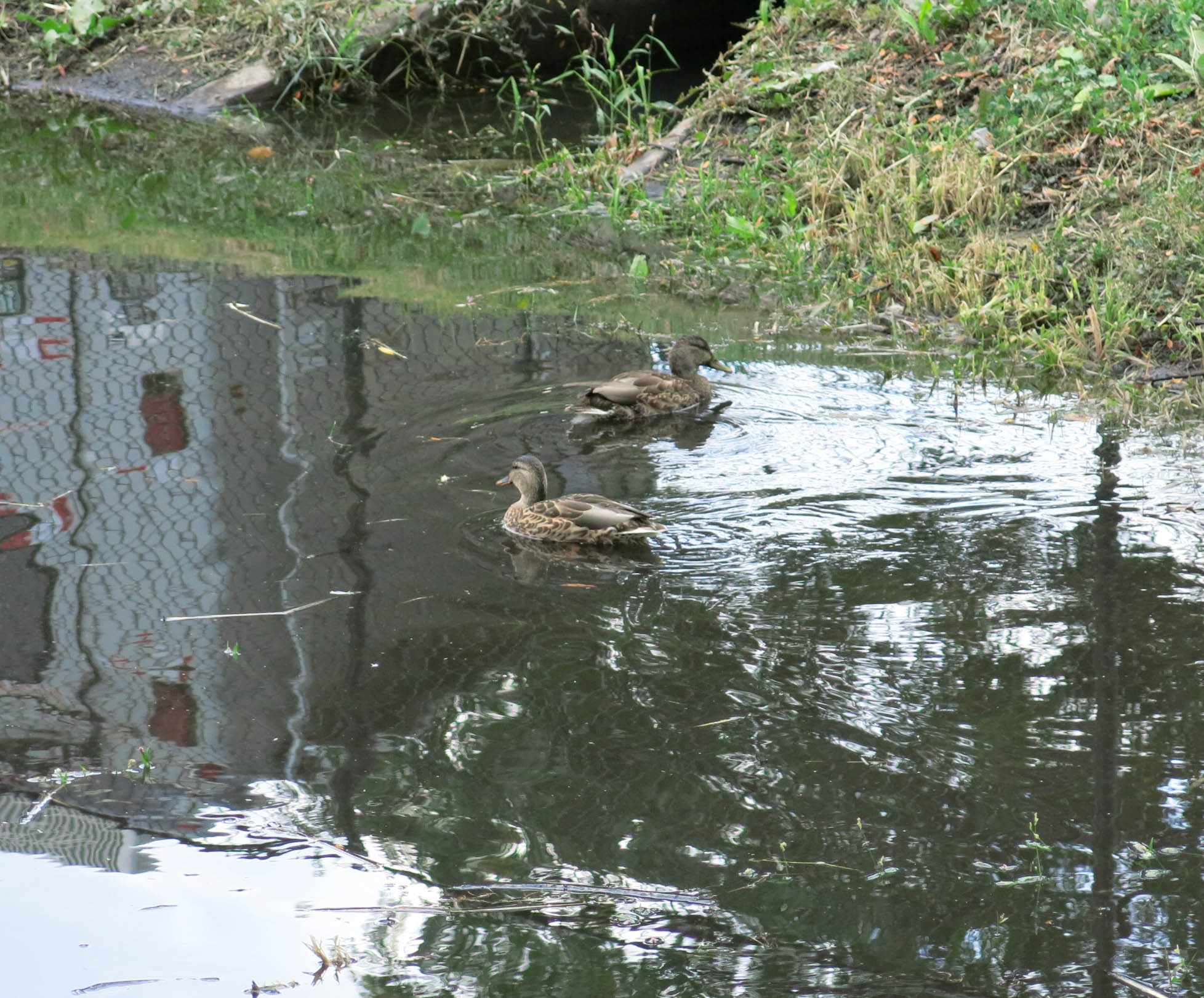 There were some ducks in what I guess you might call a retaining pond. That’s the reflection of a utility truck in the pond. And the ducks.