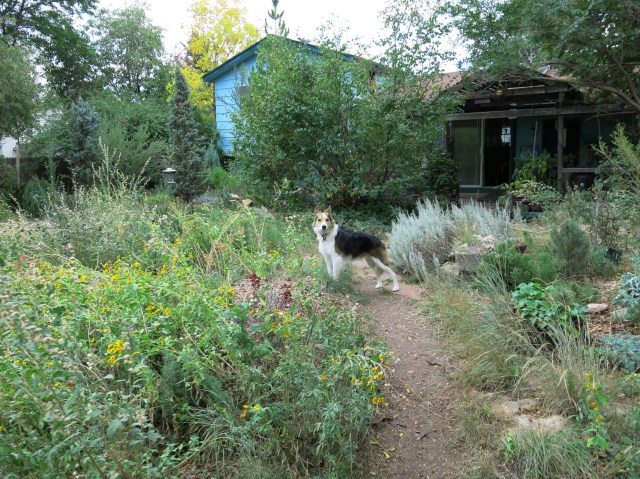You look like a show dog, Mani, and your place looks like a show garden. And I do think, looking at the rerouted downward-facing roots in pots, that the guy you live with does have evidence of deserving the “super genius” crown. That shed looks, um, intrusive. Our sunflowers that look much like yours are flowering now too. I wish they would flower later so I could use them on the Thanksgiving table, but, no, they keep to their own schedule. I’ve heard Colorado has serious mountains. Green looks like a hill. The photo with the awful water dish is one of the best photos of your garden I’ve seen. Maybe Daycare will deliver a lecture on “money shot.” With all the complaining you have to listen to, Mani, I think you should offset with bouts of silliness. Even show dogs can lose nobility every now and then, you know. Go on, try it.