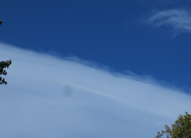 Today it was seventy-six degrees (that’s about twenty-four Celsius) with twelve percent humidity. Yesterday, the wind came up and lots of leaves blew off the trees, but unfortunately most of the leaves are still there. You can kind of see the “mountain wave” cloud that appeared yesterday. (You can also see the spot on the camera lens. The guy I live with can’t find where the spot is. He looked online to see how to replace the lens and you have to have that done professionally, so he said the lens would have the spot.)