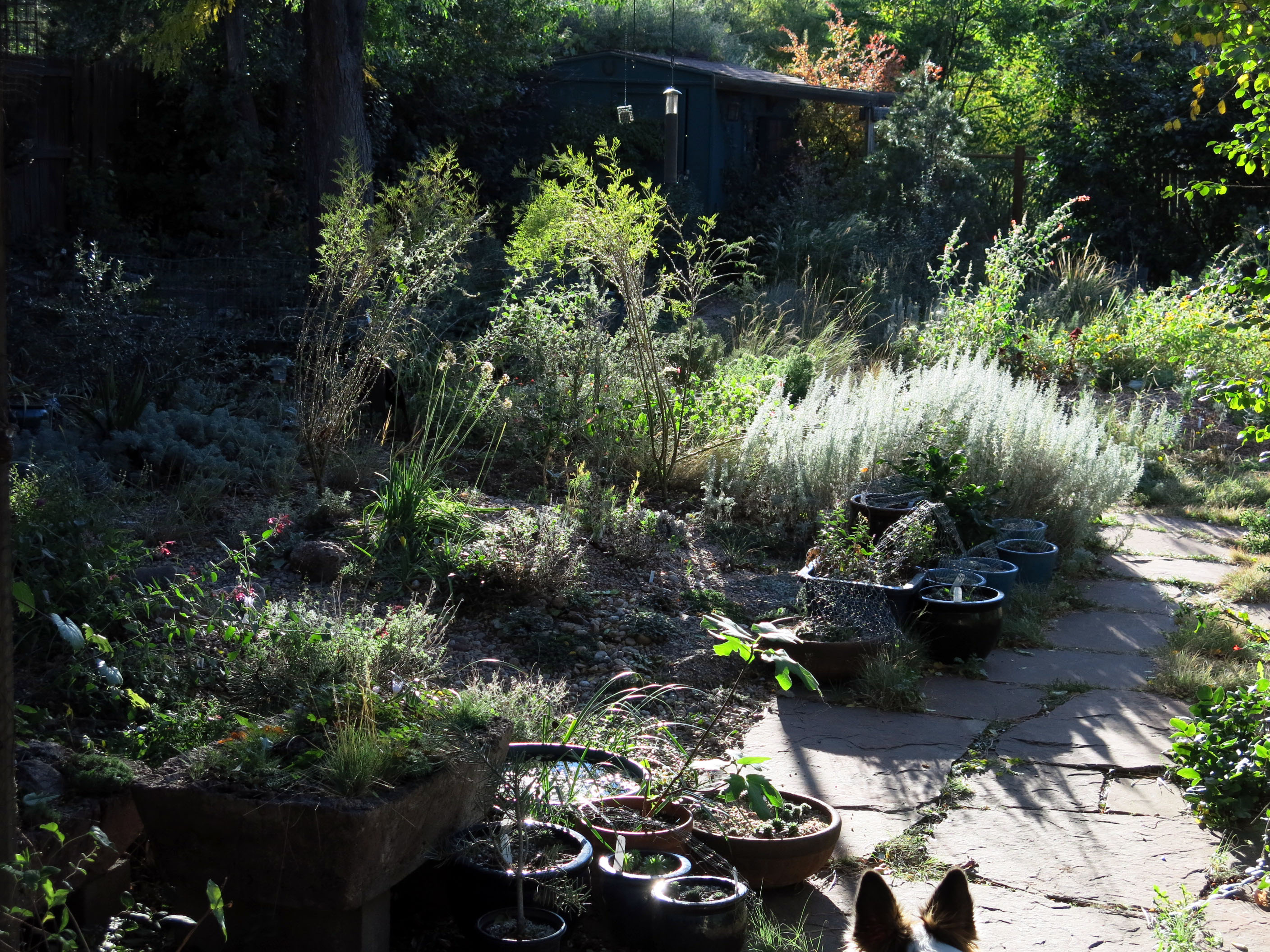 The guy I live with has been watching scary movies, so I have to leave the room. Mostly, when seed pots are tossed, nothing happens. It’s also possible that squirrels have been burying acorns, since there are a lot of oaks in the garden.