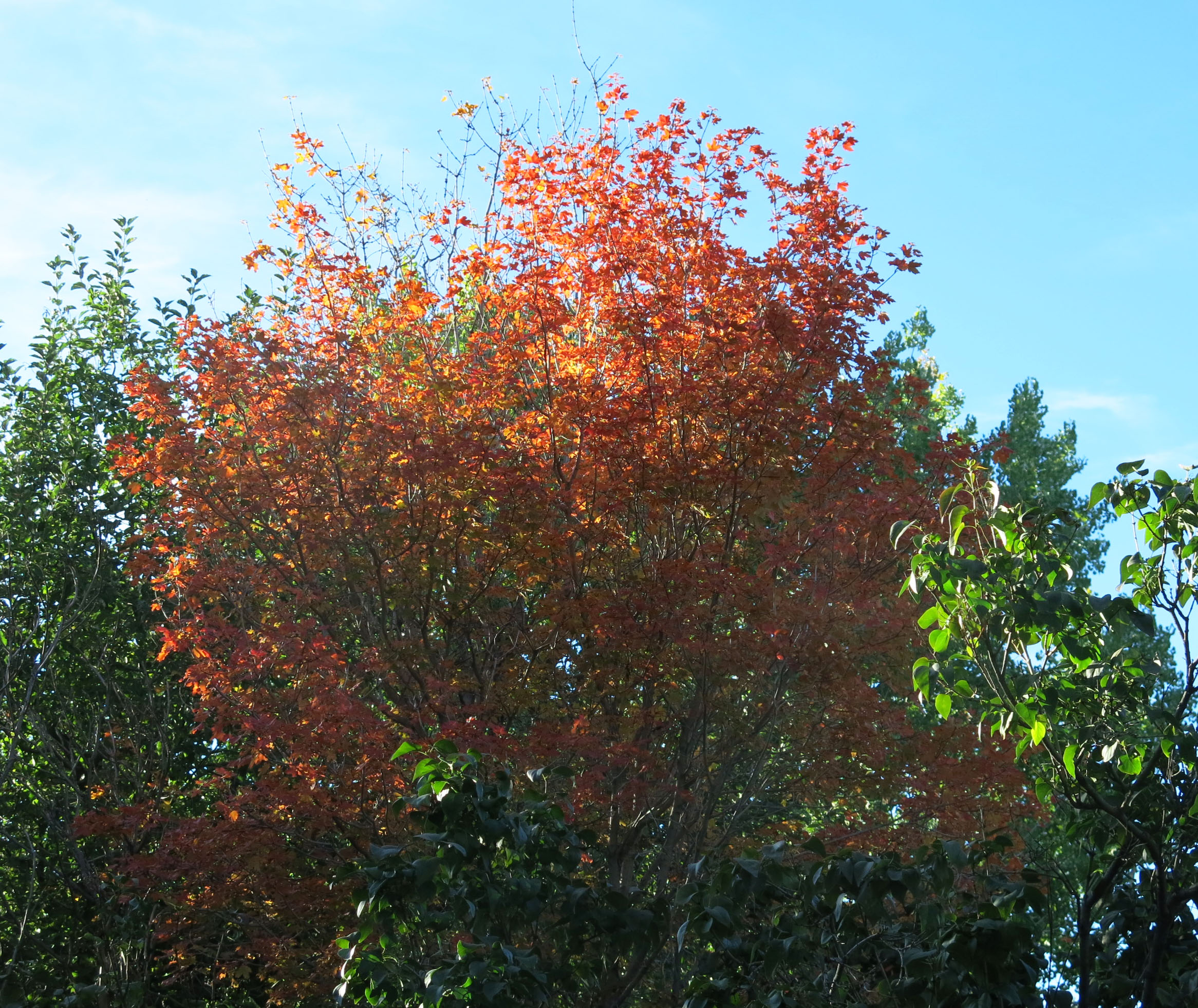 The guy I live with says that some years ago, at a nursery which is now closed, there were several Wasatch maples for sale, “landscape size”, for seventy-five dollars each. He still regrets not buying a few, but, you know, money. There is a more tree-like selection, Manzano, from the Manzano Mountains in central New Mexico, but it doesn’t get much autumn color here, because of the “late inherited growth strategy”.