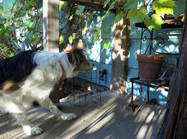 Today, we were just doing stuff, the way we do, when all of a sudden there was something in the grapevine by the kitchen window. I barked a lot. I was pretty sure it was a ghost, because it’s that time of year. The guy I live with tells me fairly often that we do live with ghosts, but nice ghosts, but I was sure this was the other kind. He got kind of weirded out, because I kept looking, and barking, and he looked too, but couldn’t see anything, even though I was sure there was something there. He said there wasn’t, but I had to check. You can see how super careful I was being.