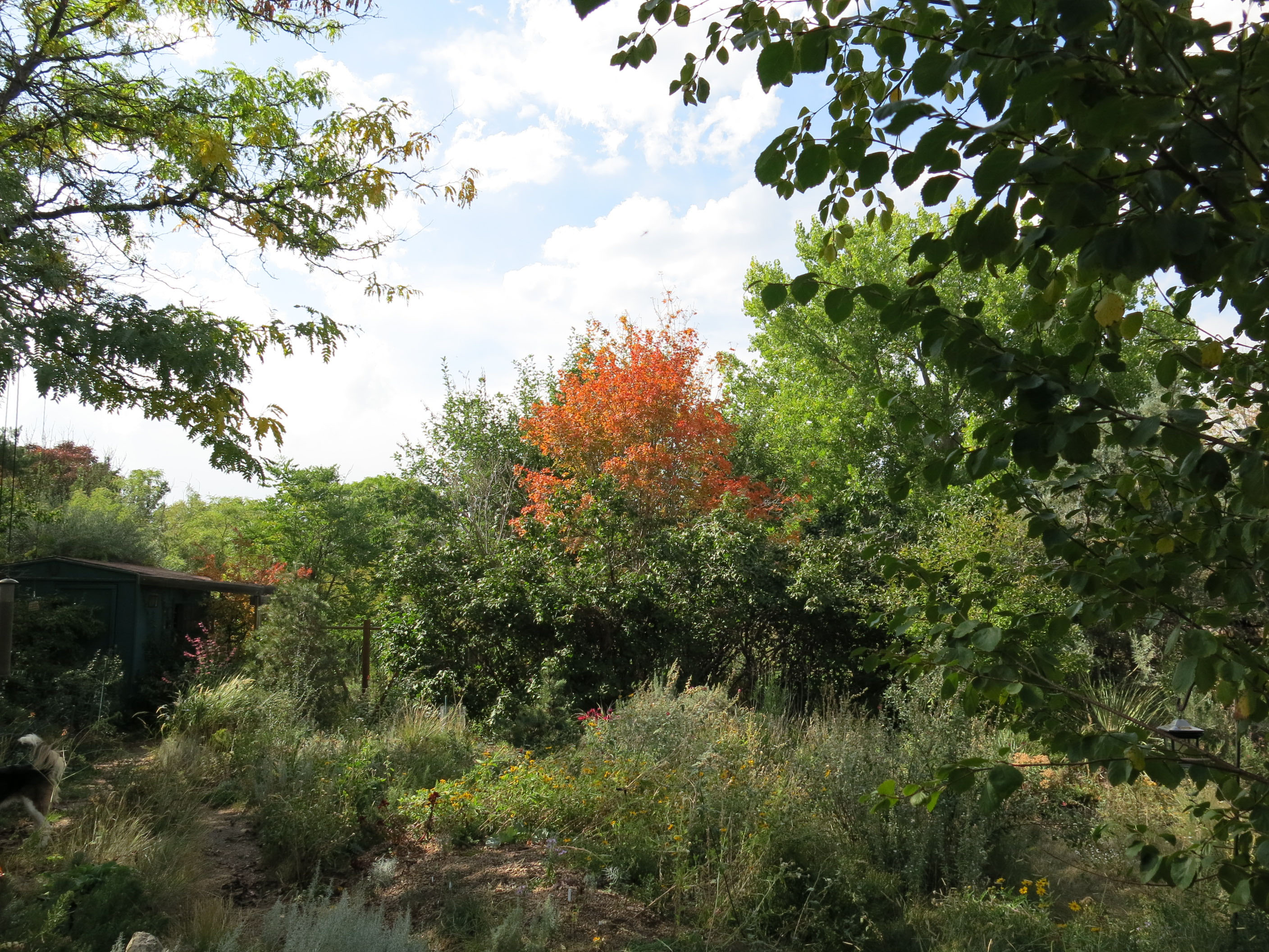 It did snow. It’s mostly melted now. My walks were kind of wet, but not very cold. It might freeze tonight, which is early for here, but not, I guess, for Denver. The guy I live with knows something about preparation for winter dormancy. Longer night length would cause leaves to start to turn, but it also has to get cooler. He said that the Wasatch maple might not need the cooler temperatures as a factor, because cold can come in the Rockies a lot more suddenly than “back east”. One day it can be hot and summery, the next, snowing. There aren’t many plants that turn red in the autumn here, though at DBG there’s an enormous Shumard oak that I hear is pretty glorious (they don’t let purebred border collies visit), and a Quercus texana, too, and Quercus buckleyi. The native Q. gambellii usually turns yellow but there are some that turn a beautiful red. The guy I live with got a whole bunch of acorns, once, and some were from a oak collected in the Oklahoma panhandle and described as being “next to ultimate red”. Nothing happened when he planted the acorns in pots. That was a few years ago. But now, this year, there are little oaks all over the garden. Maybe some are from those acorns, tossed out after nothing happened.