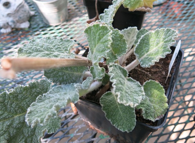 He’s afraid this will need a lot of watering here, but there’s no way to tell until we try it. Still, the leaves are cool. He said he grew one of the parent plants, Salvia moorcroftiana, decades ago. It needed watering here.