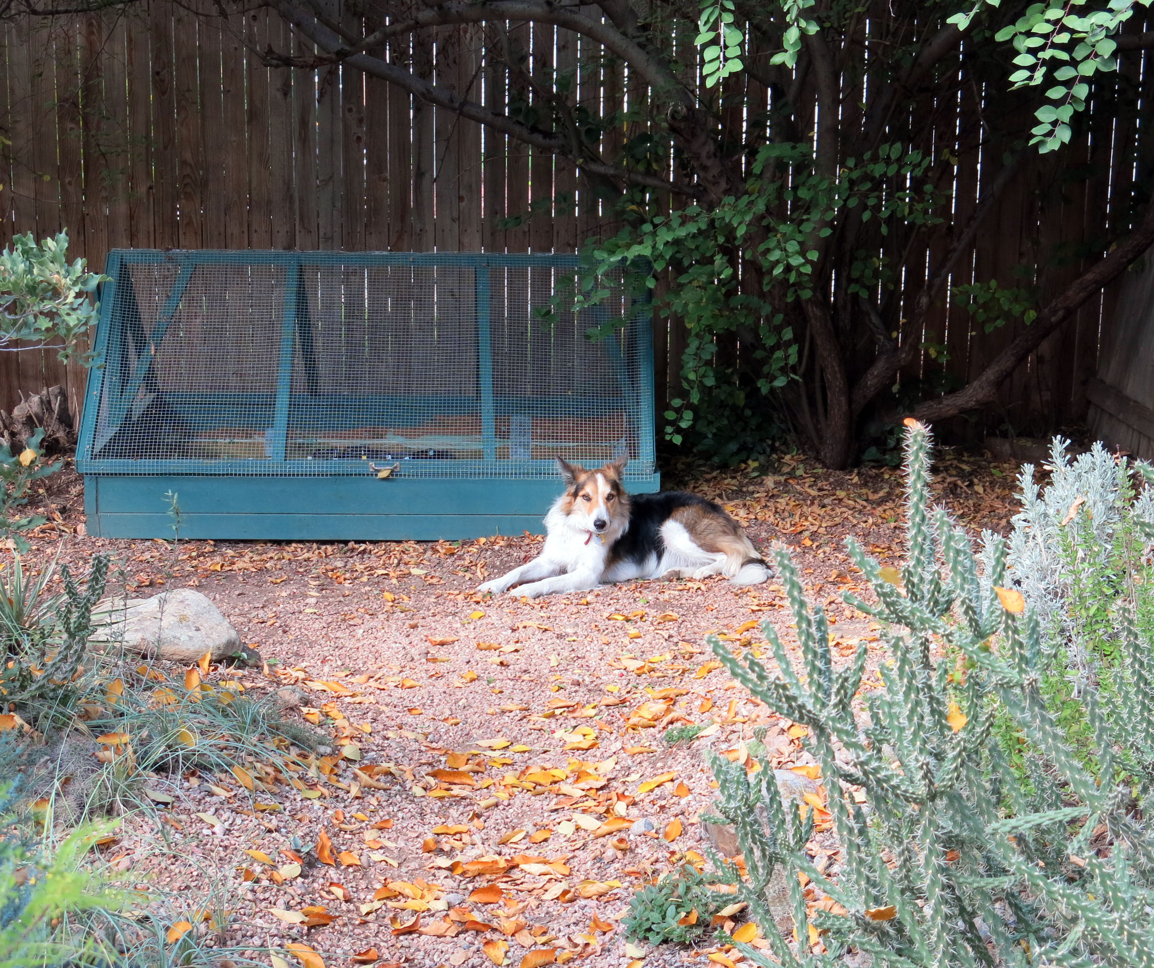 I like this part of the yard, even though it’s pretty bare. Chess, the purebred border collie who lived here before me, liked to lie here too. There wasn’t a bulb frame there, then. It’s one of the warmest places in the yard, especially in the winter.