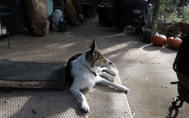 Yes, my Personal Hill is in the middle of the lawn (more or less in the middle), and my Private Lawn is in the “way back”. The pictures are taken at any old time. What happened was—and I know this is super hard to believe—the guy I live with read the instructions for the point-and-shoot and then read some about how to take pictures in blindingly bright sunlight (which we have here). To be precise, the camera is a Canon PowerShot G15, set on “P”, with exposure compensation set to something like –1 (depending on how dark the pictures come out). The paint doesn’t have much of a smell. When the guy I live with paints inside he uses a “low v.o.c.” paint, because we purebred border collies are very sensitive to weird smells. The outdoor paint isn’t like that, but still doesn’t smell much.