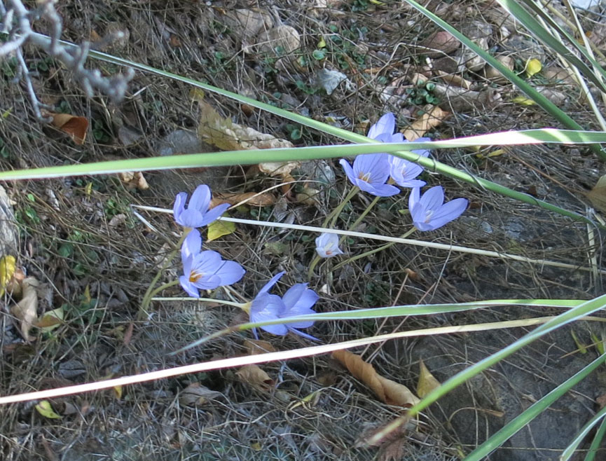 There are some crocuses and cyclamen flowering now. This is Crocus pulchellus, flowering under a yucca. I know that’s a weird place for crocuses, but they were here before the yucca was planted (at which time they had been long forgotten).