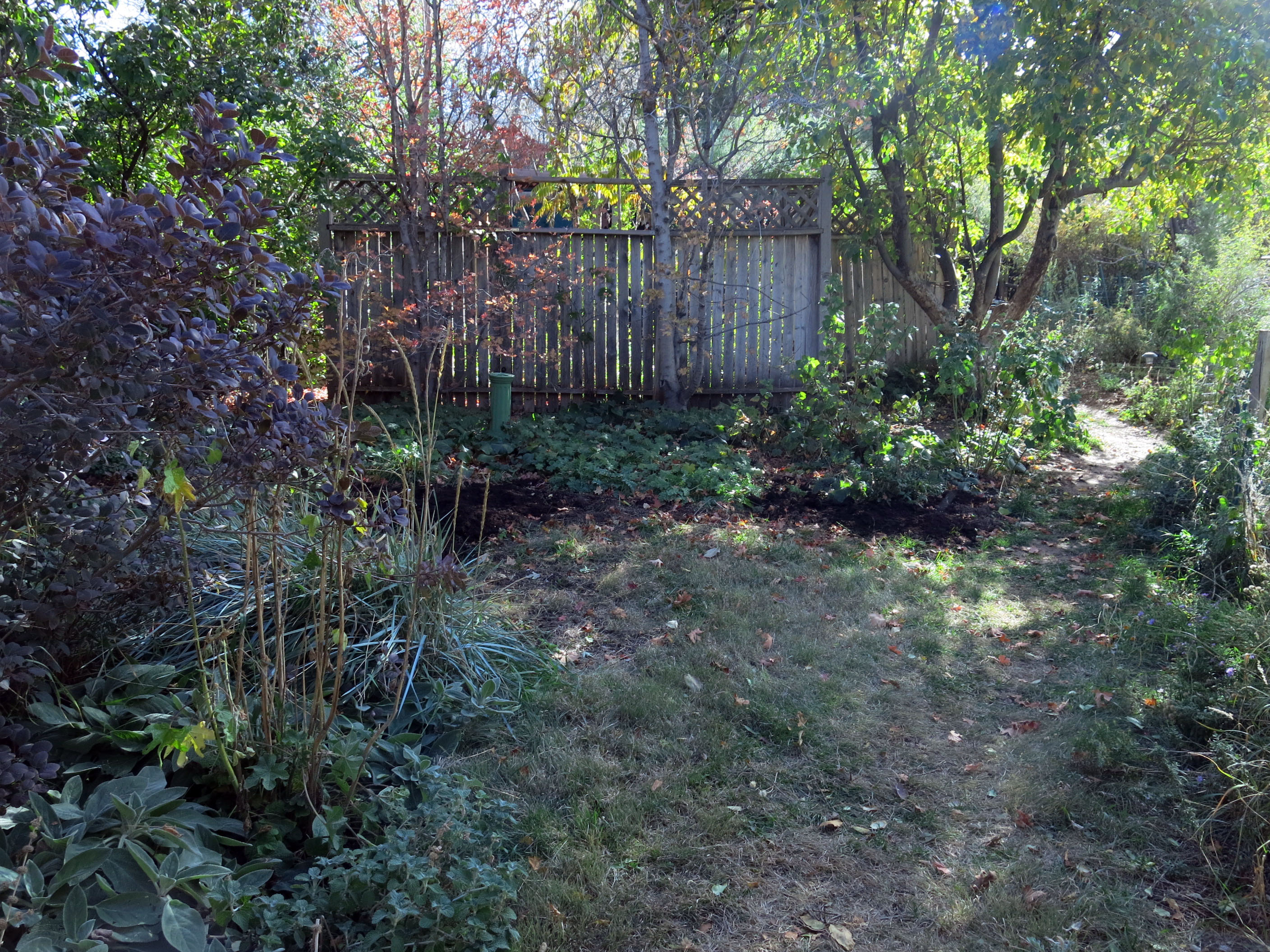 Some bagged soil, or maybe I should say “soil”, was spread in the “way back” garden. I’m not sure why this was done. The picture doesn’t do the buffalo grass lawn here much justice; it’s been doing very well. It’s my Private Lawn, if you didn’t know. The fence still hasn’t been fixed.