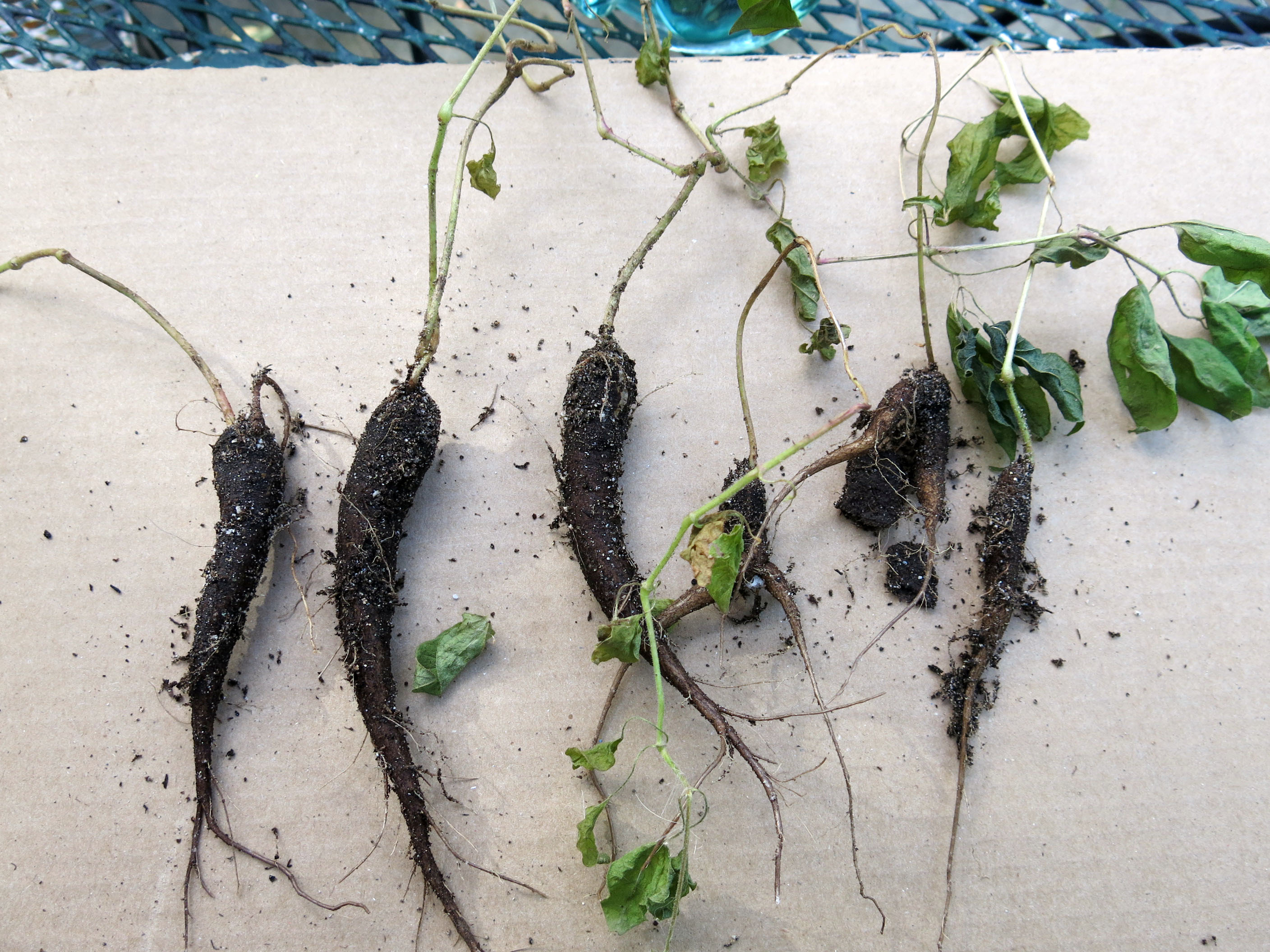 The Mirabilis longiflora got nipped (you may recall that he grew these from seed earlier this year), like the native one here (M. multiflora) does, too, and so today the guy I live with dug up the roots so that they could be planted in the garden.