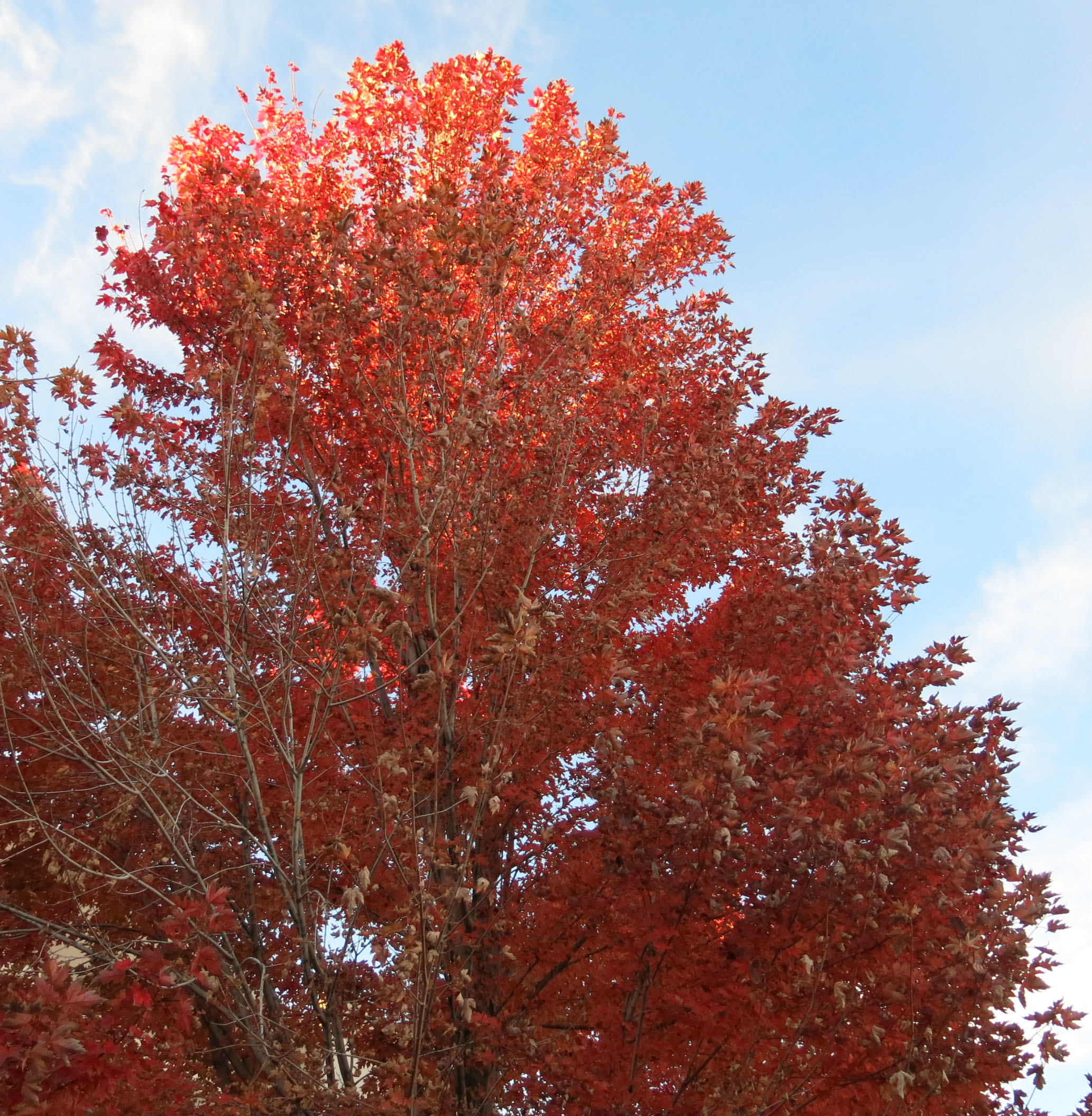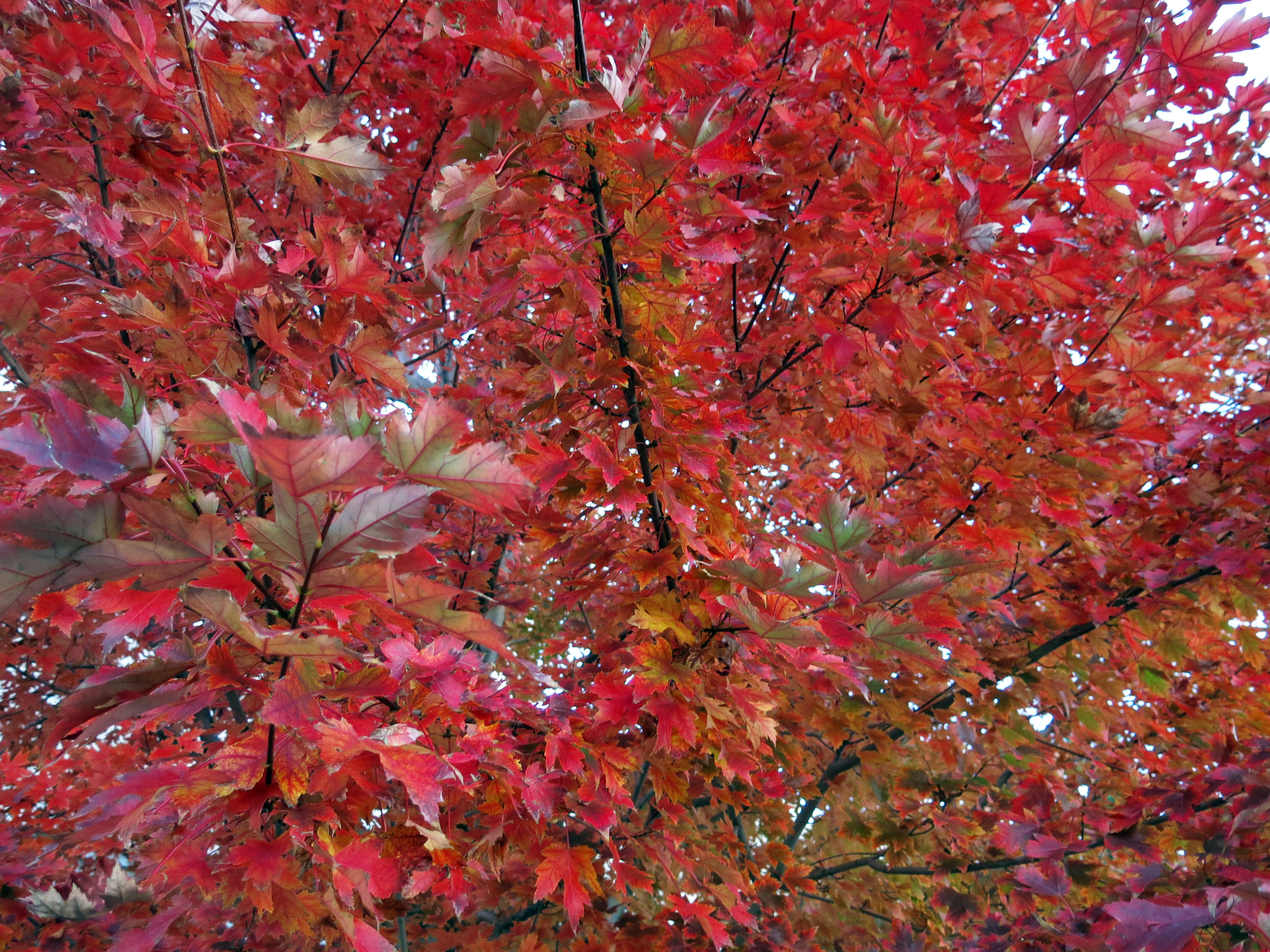 We walk over to what’s called a “frontage road” and walk down the sidewalk. Though the landscaping there is what you might call “industrial”, at this time of year it’s quite nice. I think these are Acer rubrum.