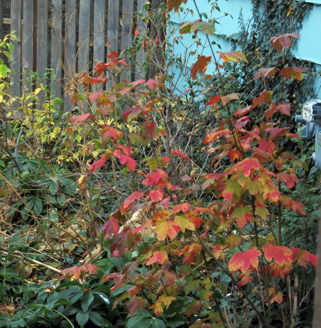 Your honeylocust looks excellent. Ours are defoliating without much color. They do that sometimes. Your vine maple is pretty sweet too. We do not even grow them here because they roast in the arid air when it gets warm. Well, it probably does not help that the few that are here are out in the full sun, along with Japanese maples. Isn’t it arid there too?