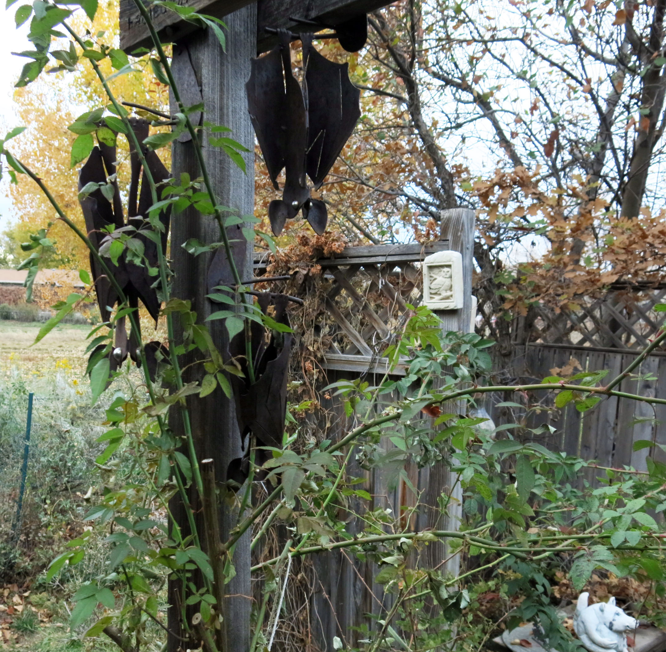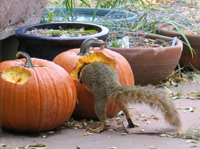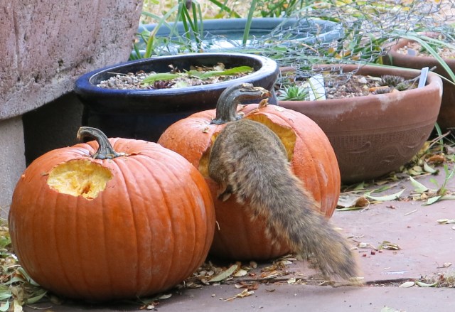 Pretty disgraceful behavior, if you ask me. The pumpkins were moved farther down the path so the squirrels wouldn’t make a mess on the patio.