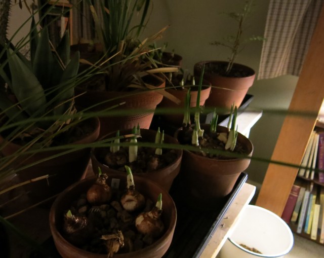 These are pots of the really common paperwhite, called ‘Ziva’, and also of some different ones, ‘Nir’, ‘Inbal’, and ‘Ariel’. Some people don’t care for the fragrance but the guy I live with says “Pfft”, which he says a lot, anyway.