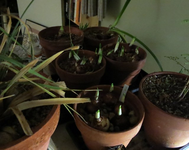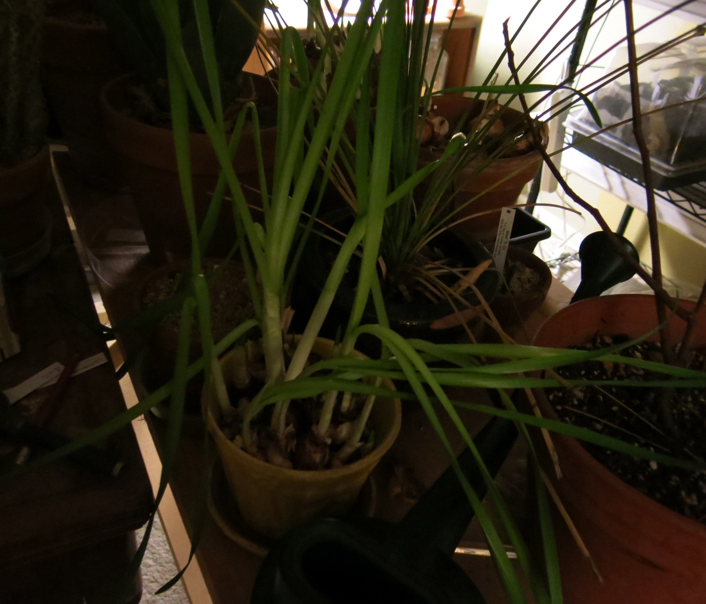 Since they don’t get any nutrients if they’re just grown in gravel and watered, most people throw away the bulbs, which the guy I live with said was fairly senseless. The bulbs from last year aren’t going to flower this year because they didn’t get any food last year, but at least they’re still alive. They’ll get fed when the foliage starts to fade. And then if growing them in soil-less mix works, that’s the way it will be done from now on.