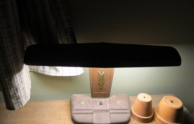 This lamp came from his grandparents. It sat on a desk in the hallway, in their house in Los Angeles. On the same table sat a Model 302 desk telephone, the kind with the heavy receiver and metal dial. The guy I live with says that the only thing lacking from his memory of the desk, lamp, and phone was Humphrey Bogart sitting at the desk, talking on the phone, writing something in a notepad.
