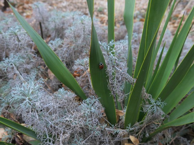 The guy I live with went to the store, and when he came back, there was a ladybug on the Yucca rupicola. The guy I live with told me that ladybugs bite, and so I give them a wide berth. That’s easy to do, because ladybugs are little.