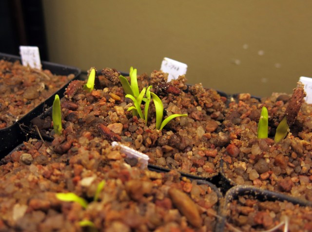 That’s really the gardening news, here. He thought these seeds would need stratification or have to be sown outdoors in pots and then nothing would happen, but instead this is happening, the seeds just sown in pots, the pots put in a propagator under lights, and with a heating pad underneath.