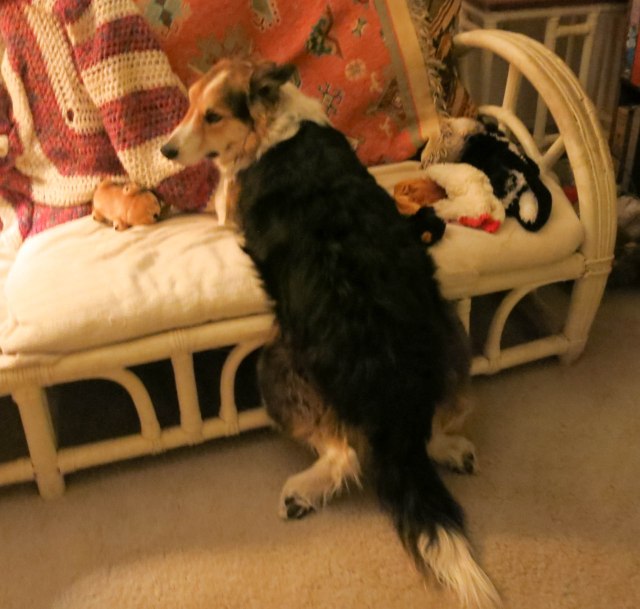 What I really want to do, I mean really, is tickle those hairy feet hanging off the couch. I see it’s also the storage area for extra toys. Do you get your long leash wrapped around stuff? I wonder how TGYLW reels you in quickly if you go towards something icky or dangerous. Just wondering…