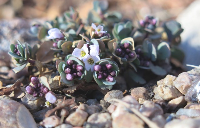 This little plant is also known as Eunomia oppositifolia. I wondered about the gender agreement when I heard this; you know, Aethionema oppositifolium, but Eunomia oppositifolia, until the guy I live with said that the Greek ending –nema was neuter gender and so the specific epithet would take a neuter ending, -um.