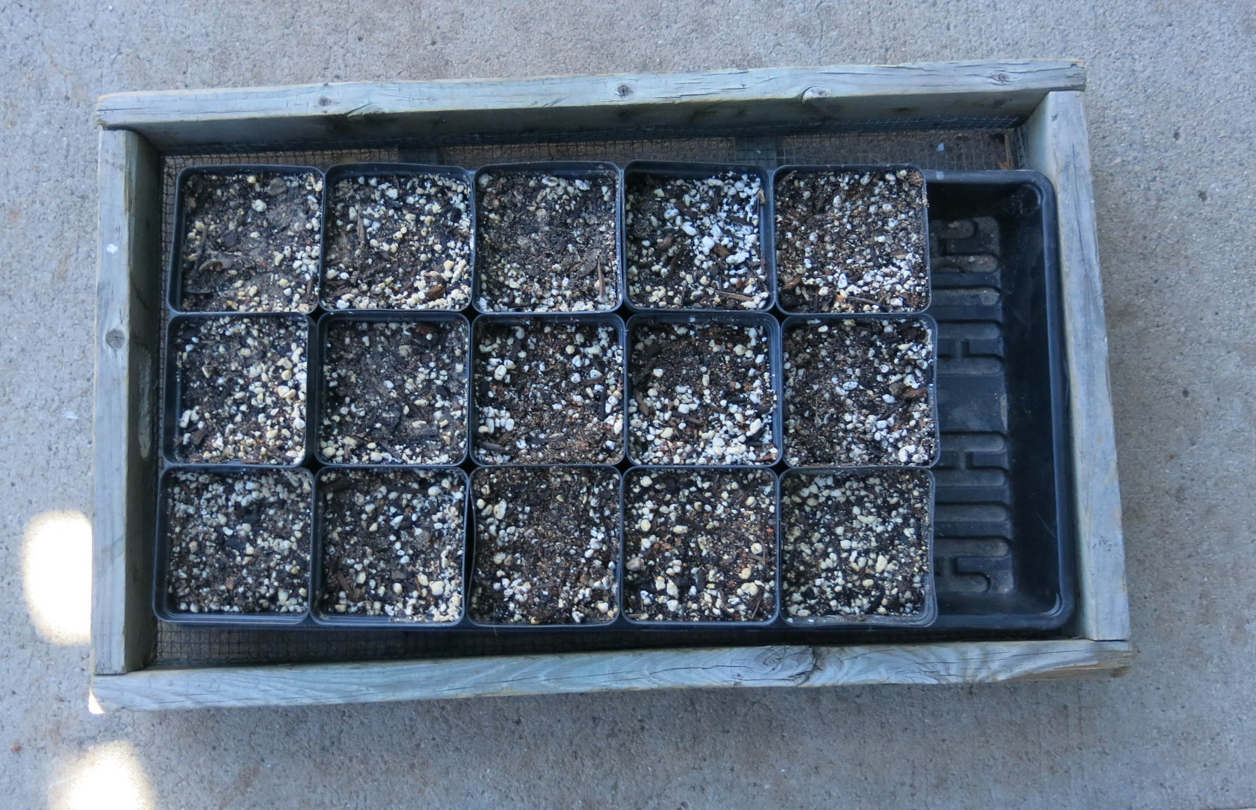 The seeds were sown into these pots, which are going upstairs under lights. The guy I live with is not happy about the soil-less mix at all, but he says it will do for now. A little fine gravel was sprinkled on top of the seeds.