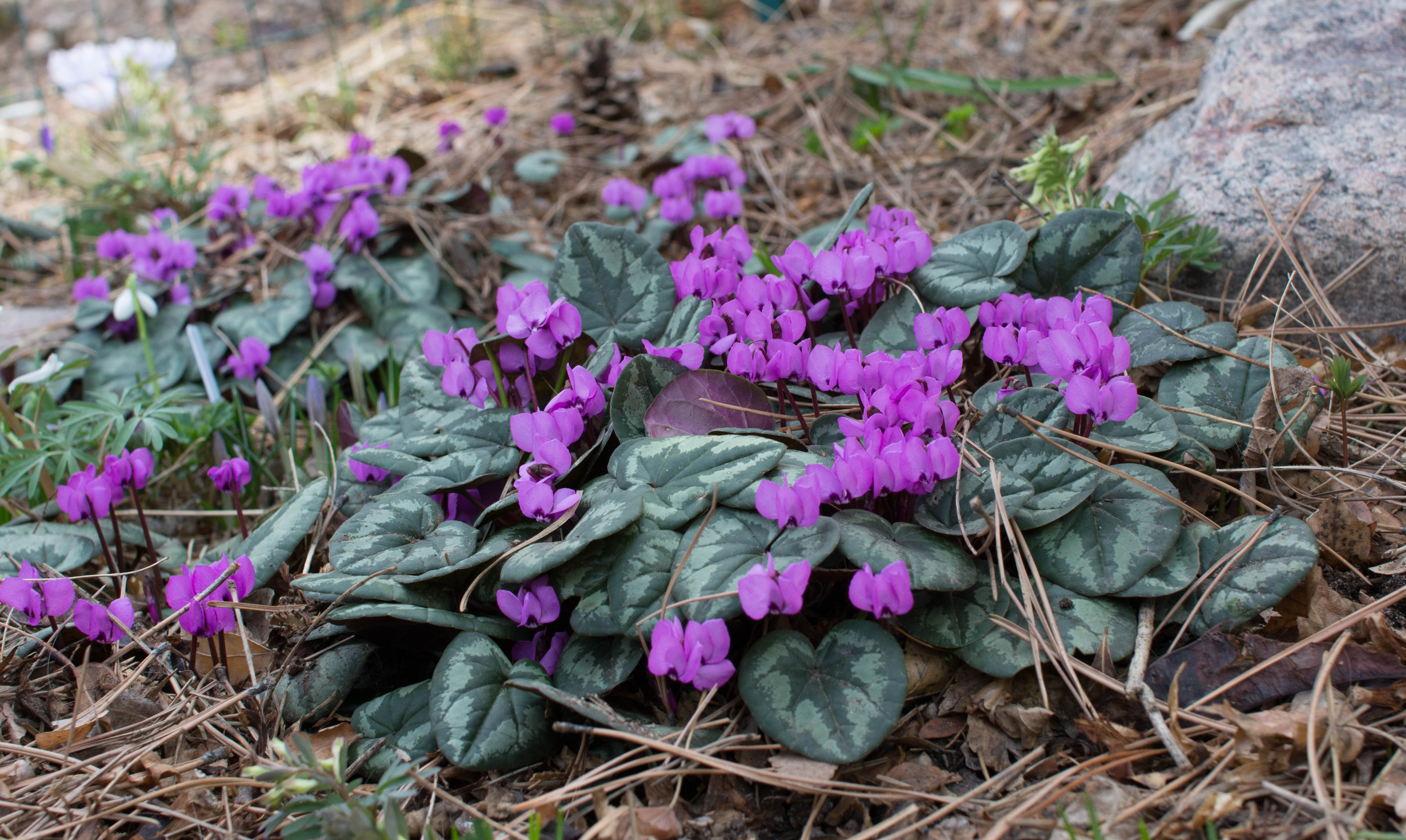 There are lots of cyclamen in flower here now. Cyclamen coum. They’re actually about three weeks late because the soil froze. Now it’s thawed out and everything seems fine.