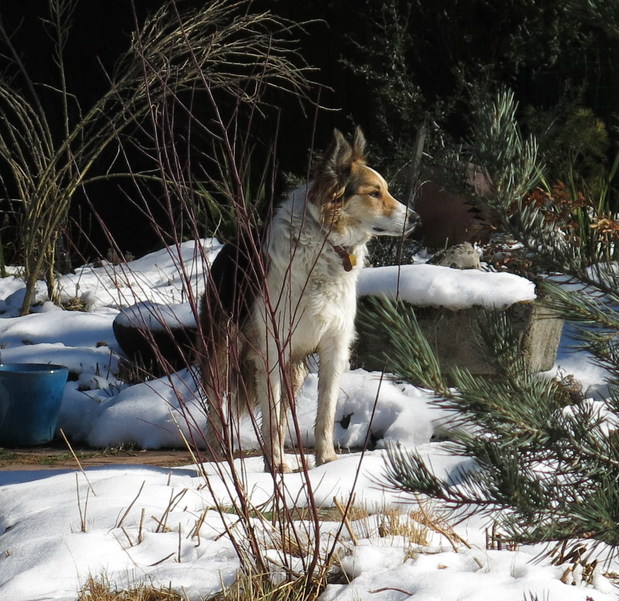 Yes, you do photograph well, Mani, and snow becomes you. You look like the dog to appreciate those energetic iris and the adorable cyclamen. Where I grew up as a girl – sadly, border-collie deficient – Crawdad Crick ran in back of the avocado grove and the hiking there was delightfully sage-scented. You never mention the fragrance of your walks, and now I wonder. Can you smell cold snow? I’m sure you’ll keep us informed of the progress of mysterious doings. My guess is that patch is shortly to be lifted from the nondescript. Oh, and your crawdad canal remarkably resembles my crick. And that is one sweet-looking coyote. That would be a great country-western lyric, “Crawdads and Coyotes.” Maybe you could bark along.