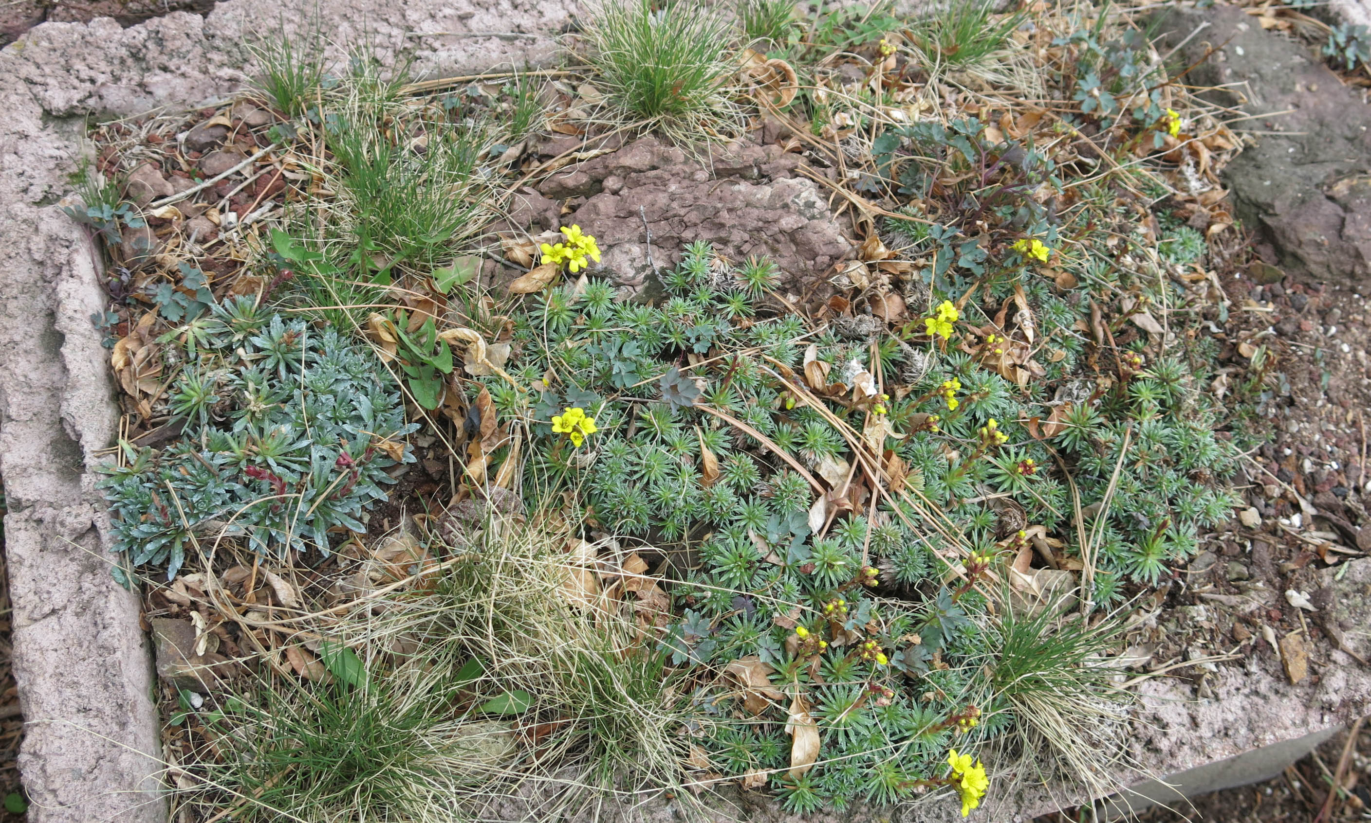There’s another thing going on, and this is kind of sad. Maybe not for me, but for the guy I live with. He’s decided to do some downsizing and rearranging. The three troughs near the patio, that you often see in pictures, were at one time filled with porophyllum saxifrages, and in fact there were over sixty of them here. He would read and re-read the book on them, dream of getting more saxifrages (not easy to acquire), and when they began to flower, usually in March, sometimes in the snow, that would be very exciting. And best of all, his wife really liked them, the leaves and flowers, but after she died the saxifrages didn’t get the care they should have gotten, and so there are only a few now, and these are being moved.