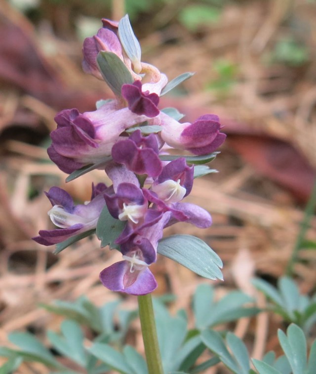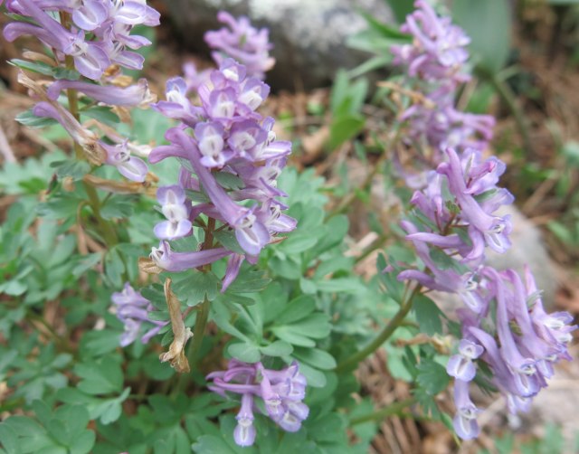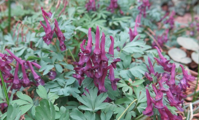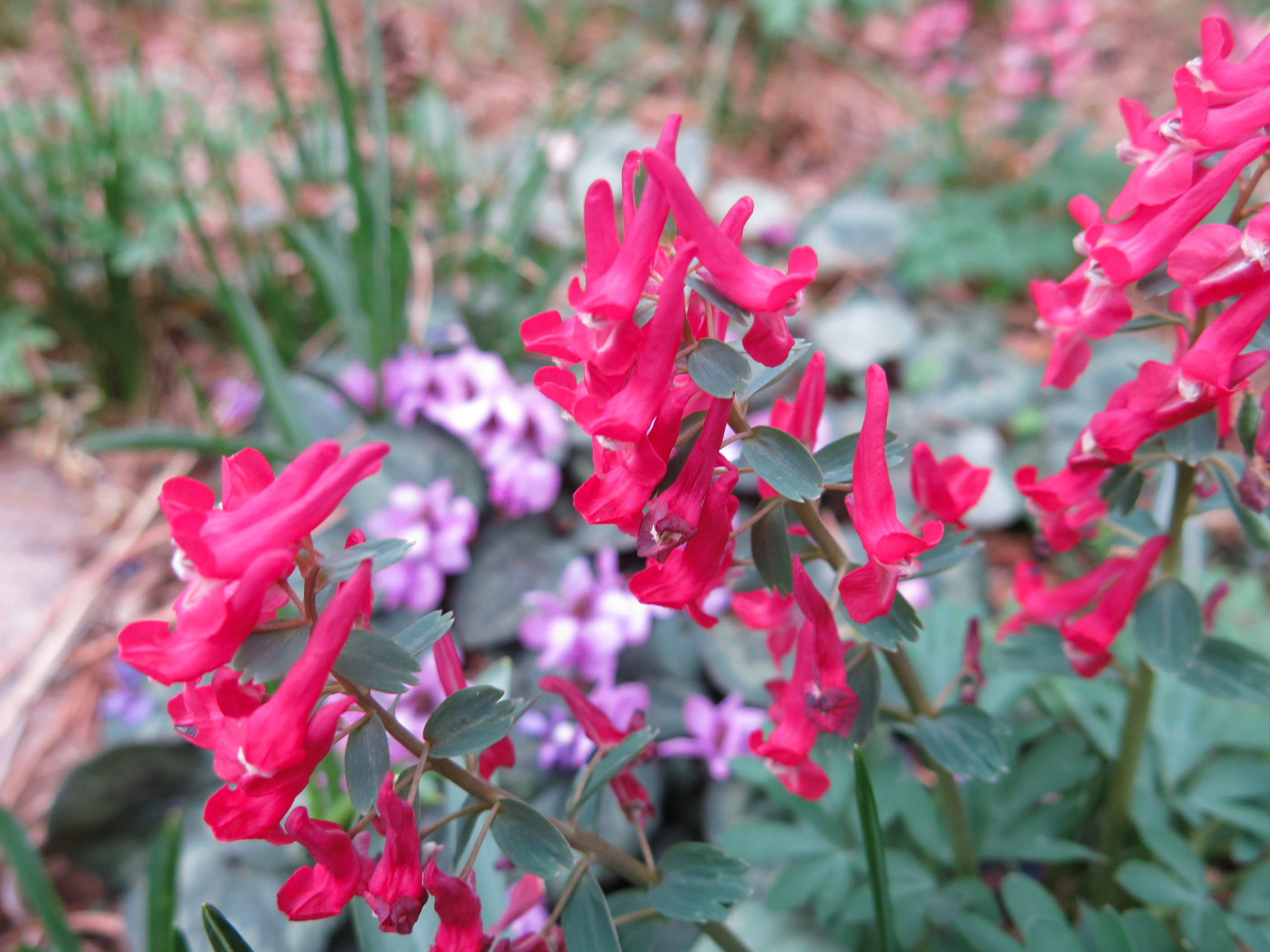 There are a lot of corydalis flowering now; these are forms of Corydalis solida. Some of them still have labels. The guy I live with said that a certain purebred border collie puppy swiped a lot of the labels, so we’re not sure what all the names are, here.