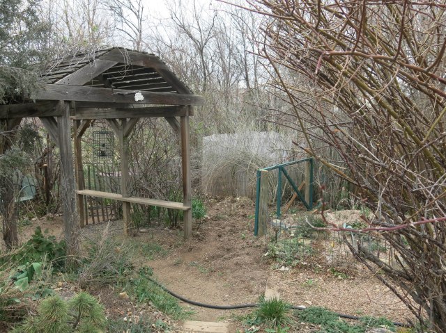 The green fence is new, and possibly ugly, but this little corner got cleared out, as I mentioned a while ago. Really the only thing that was done was a bunch of branches from the New Mexican privet were cut back, and suddenly this space became visible, and empty. The definitely ugly bamboo fence is now super-visible, but won’t be during the summer.