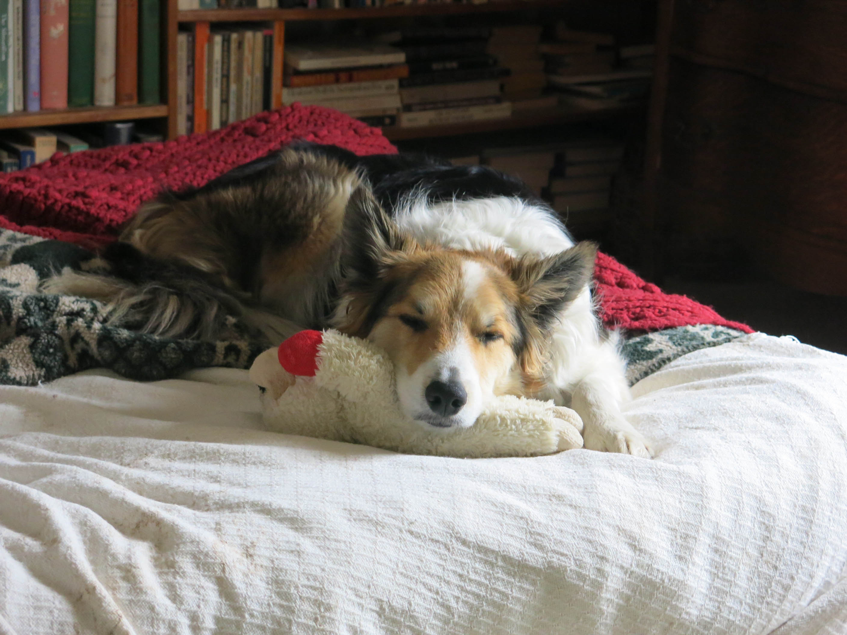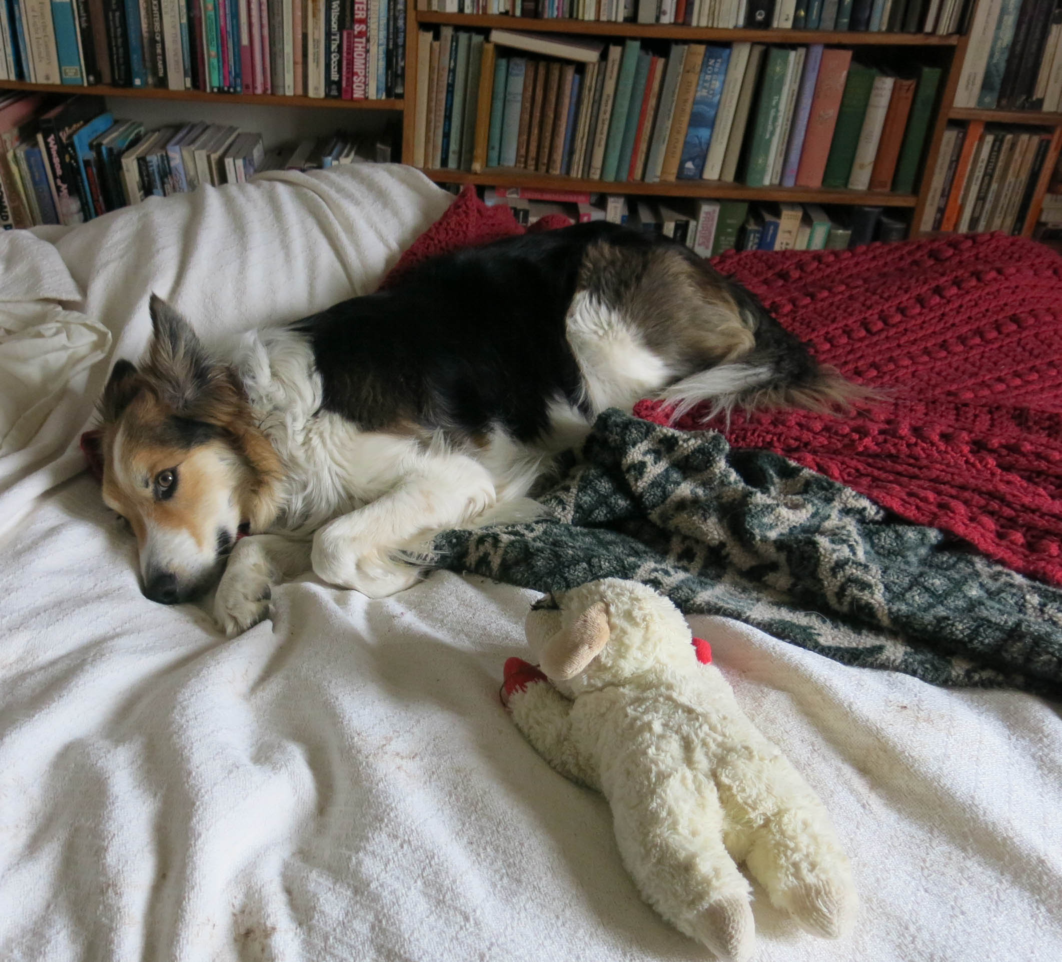 How does such an accomplished photographer forget his camera, ask the guy you live with, Mani. He evidently does know how to construct a handsome fence and how to properly prepare toast. I’ve found charity sales the best source for jelly and jam made from local fruit, and the spring garden club sales are happening RIGHT NOW. Of course, by the evidence, you are still held hostage by winter. I envy you your plum trees. What a very lucky border collie you are, with trees in bloom, voles and crawdads and muskrats to keep you entertained, and then second-best Pottery Barn sheets in which to nestle. Ms. Lambchop looks unmolested, and does make a sweet spot for head-resting.