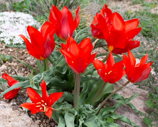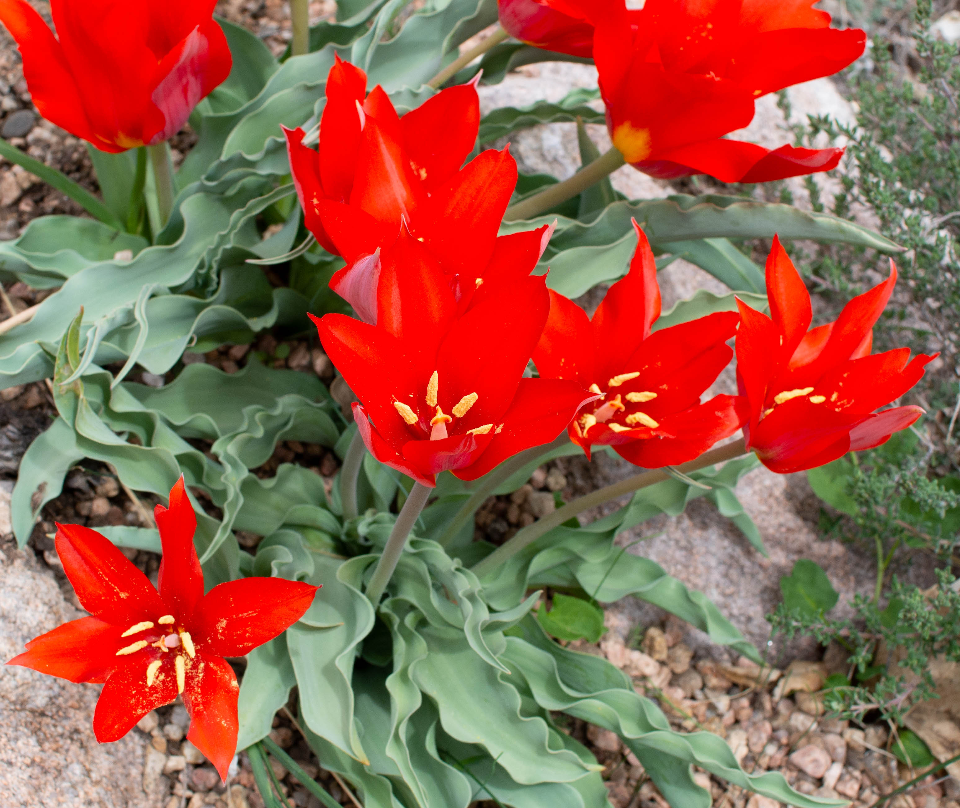There are several red tulips flowering in the garden, or so I’m told. This is Tulipa butkovii, one of the reddest. Also one of the hugest. When fully opened the flowers can be six inches (fifteen centimeters) across.