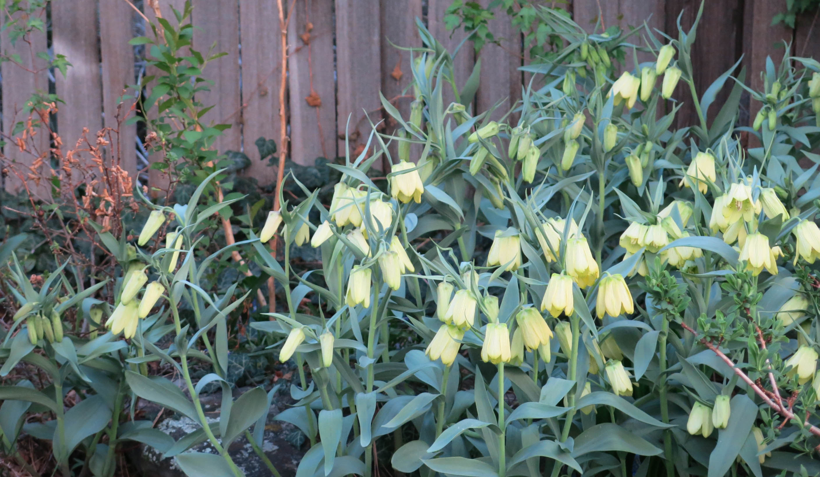 This colony of Fritillaria pallidiflora was started from a few plants grown from seed, years ago. The bulbs have produced a lot of seed; there are even more plants than you can see here. It is kind of amazing that this happened, since so many other attempts at growing bulbs from seed have been spectacular failures.