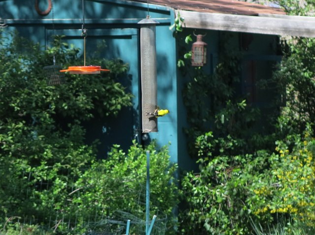 Speaking of things that fly, the guy I live with said “The yellow pigs are back”, and at first I was confused, because I know pigs don’t fly, but he meant goldfinches. These pictures were taken using the point-and-shoot zoom feature so they’re not super sharp, but you get the idea.