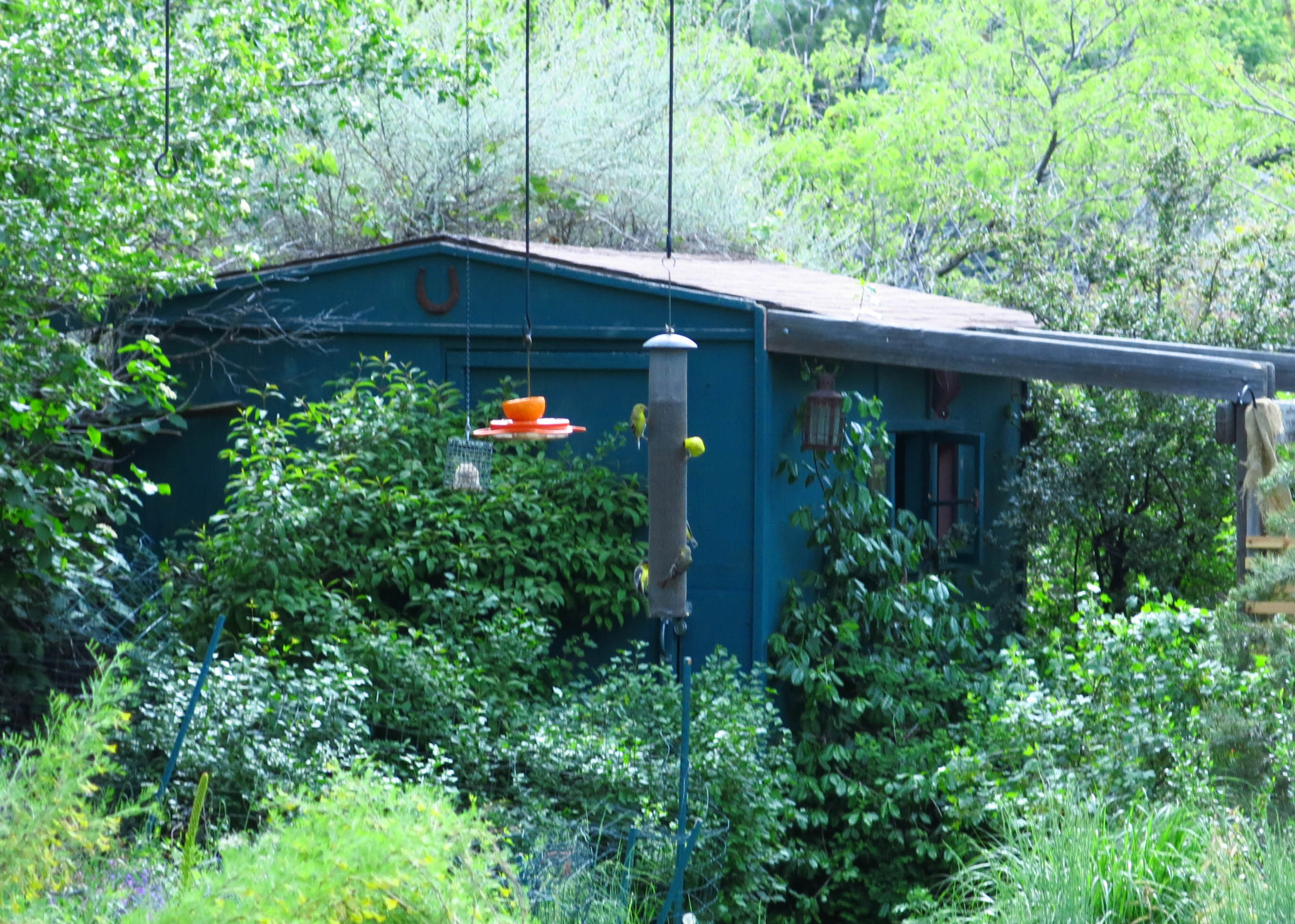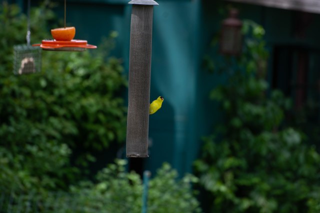 The guy I live with said he thinks we have two species of goldfinch visiting the feeder; the American (Carduelis tristis), and the Lesser (C. psaltria). Apparently (he took Latin but doesn’t remember this word) “carduelis” is the Latin name for “goldfinch”. Carduus is the Latin name for “thistle” so I guess you can see the connection. Thistles were used to card wool back in the old days and so “carding” also comes from the Latin word for thistle. The guy I live with said when he worked outside for the phone company they had a device which was called a “carding file”or “file card” which was used to roughen the surface of telephone cable during a repair, but is also used to remove metal from files.
