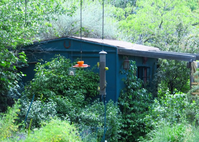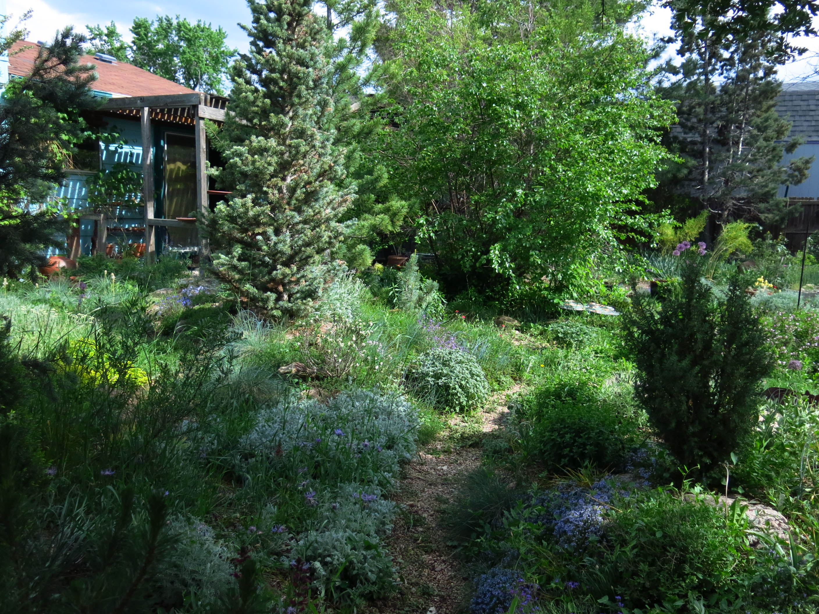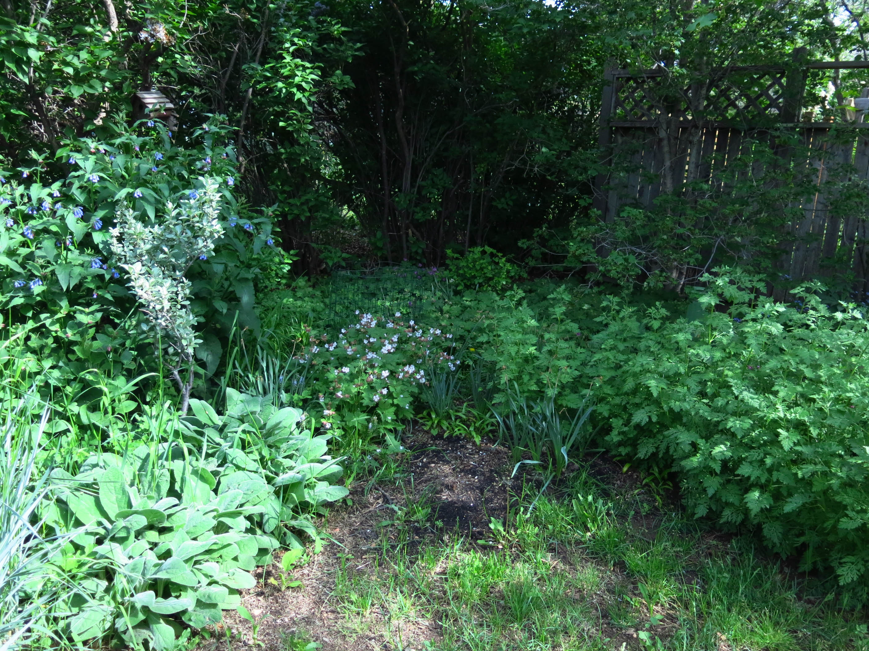 Even the “way back” is green now. It looked kind of forlorn last month. Those are geraniums in flower.