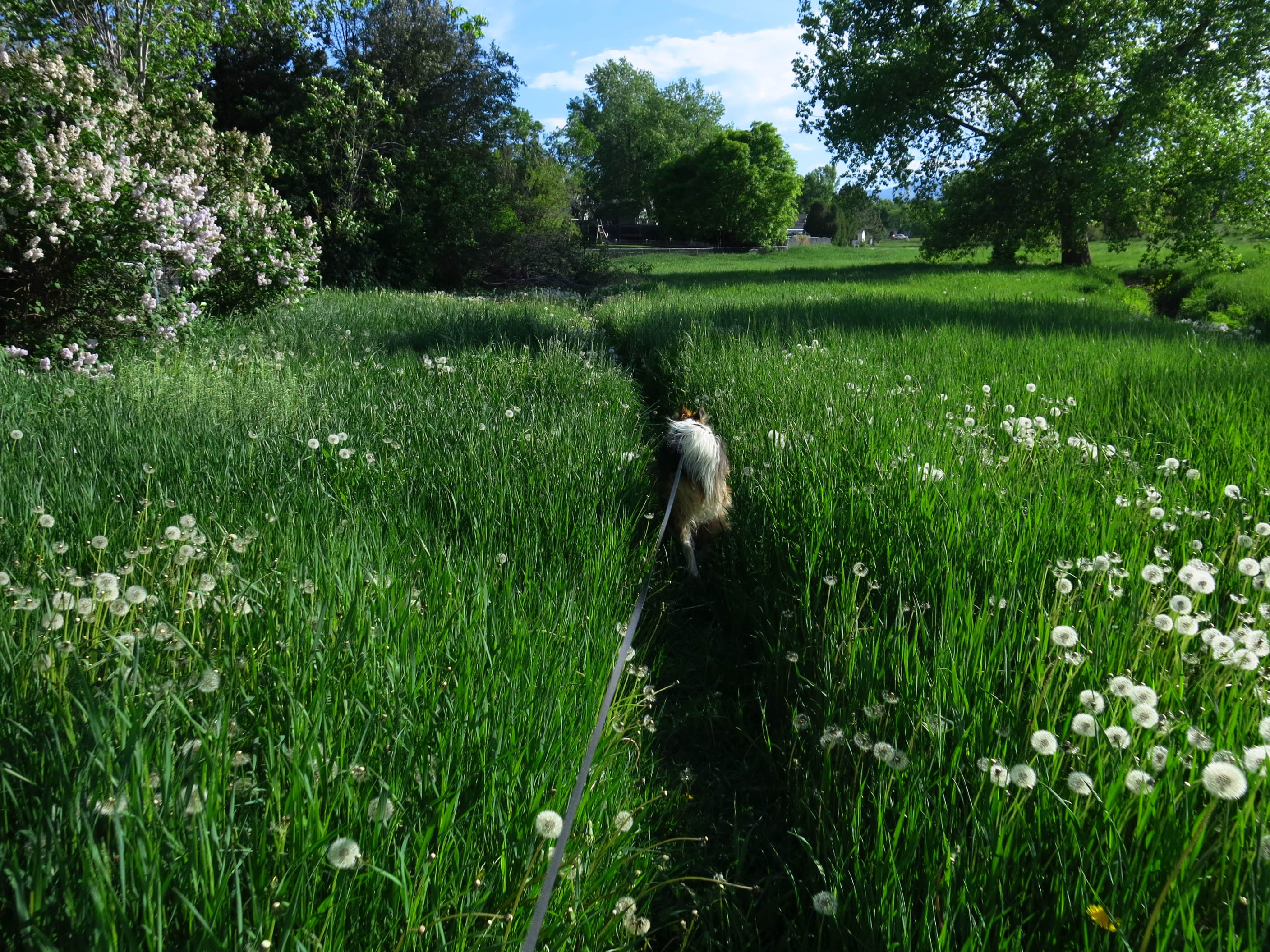 So that’s the news for today. I’ll take my leave with a picture of me on my walk, following the coyote path through a sea of smooth brome and dandelions.