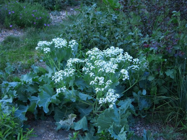 The sea kale (Crambe maritima) is doing pretty well. This is the first year it’s flowered like this, but that’s because the first plants were moved all over the garden and so never did anything. Then new ones were planted a few years ago, moved again, and then moved once more, then supposedly permanently removed, but the roots survived and now we have flowering sea kale.