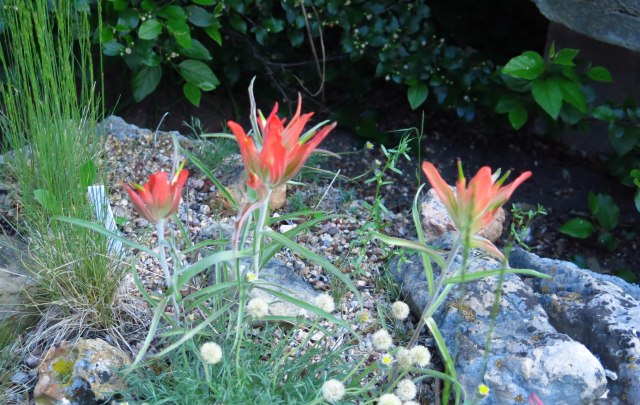 There are paintbrushes flowering in the trough. These are Castilleja integra. (The guy I live with said to say this is the easiest paintbrush to grow.)