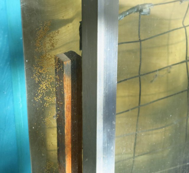 We have a whole bunch of baby spiders behind the sliding glass door. There are two doors; the outer one was added later. That’s one reason why you see the wooden ramp in so many pictures; the addition of the outer door made the threshold or whatever so short that a ramp seemed like a good idea (it was also for aging purebred border collies to get in and out of the kitchen). I’m not really thrilled with the idea of hundreds of spiders trying to crawl on me but the guy I live with said he would make sure they went outside.