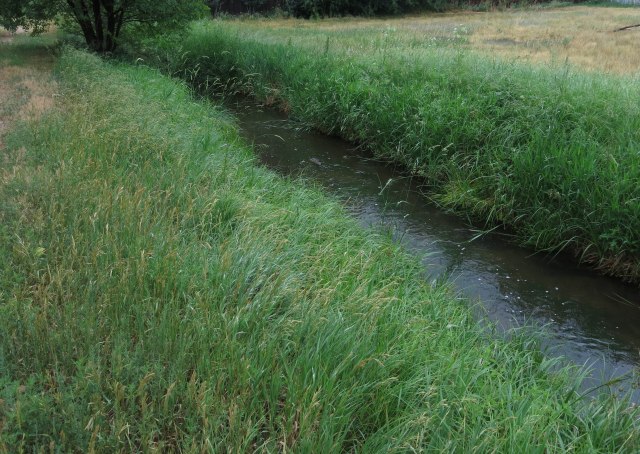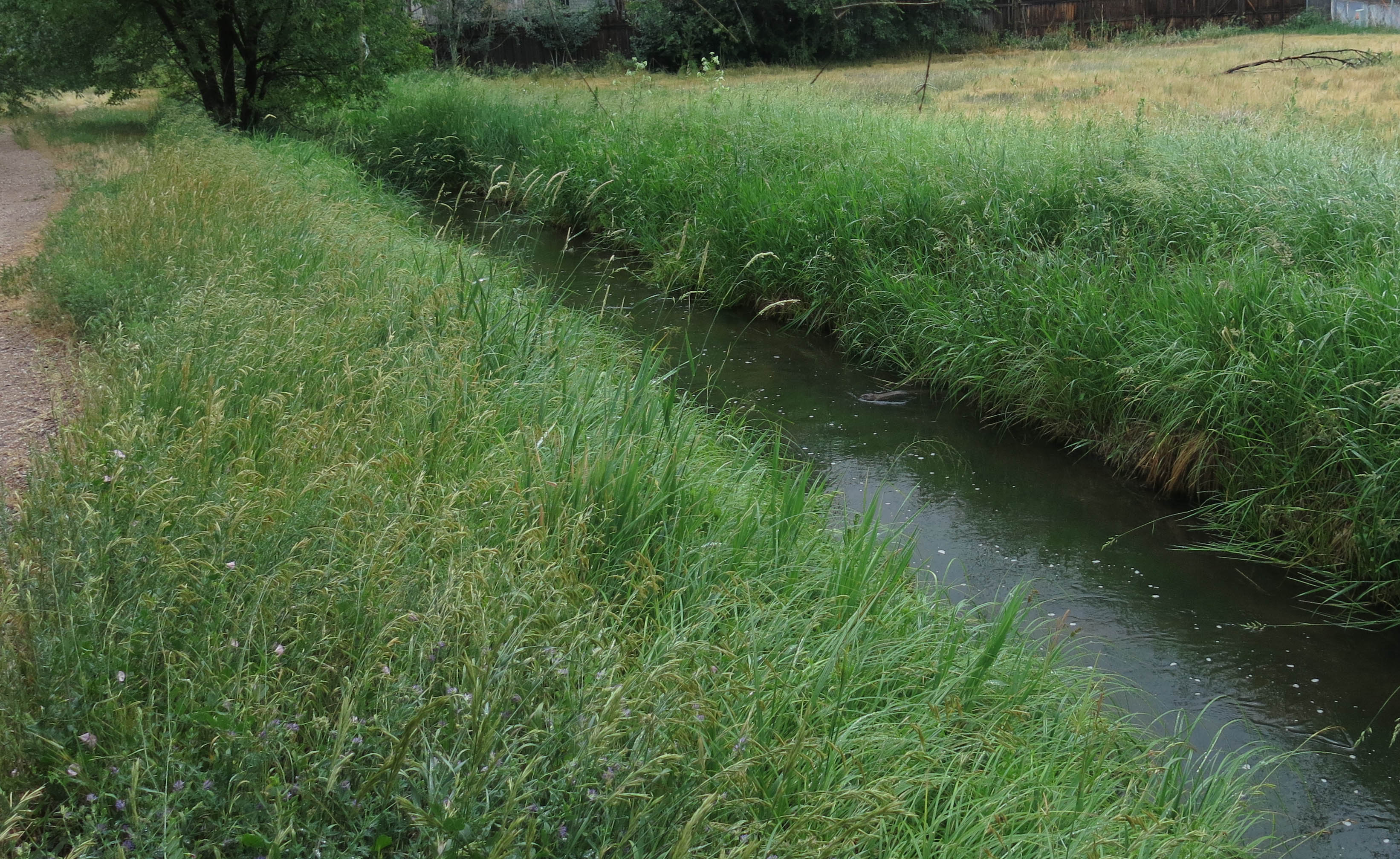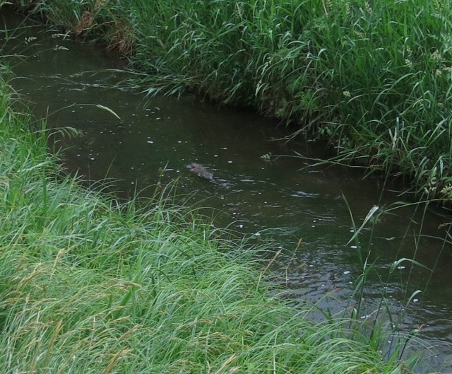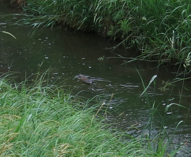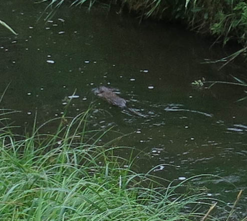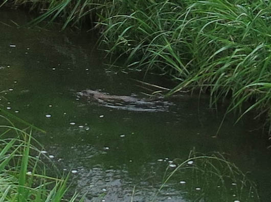 The only other thing I have, and it’s kind of a big deal, though not as big a deal to me as the baby raccoons sleeping in the New Mexican locust just now, which the guy I live with couldn’t get a picture of, even though I was barking like crazy, is the happy, happy muskrat we saw a few days ago. You can see it here, leaving its happy home, to paddle happily down the canal.