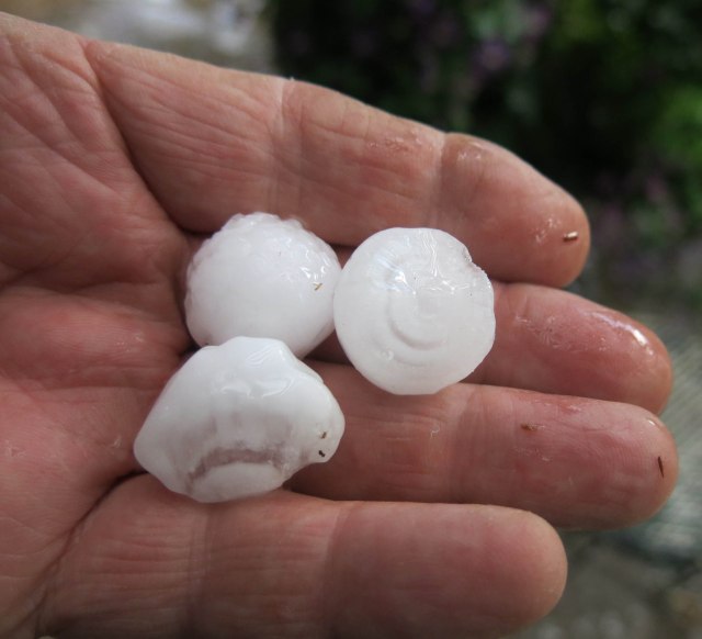That hail really looks scary. It could do some serious damage. I have never experienced hail like that. We only get the tiny gravely type. Years ago, there was serious hail storm that parked right over Beverly Hills and left a deep accumulation of hail. The hail was not big or damaging or even very scary, but was so abundant that it just piled up in a very unreal way. It looked like snow. The guy you live with can probably tell you how it happens there sometimes.