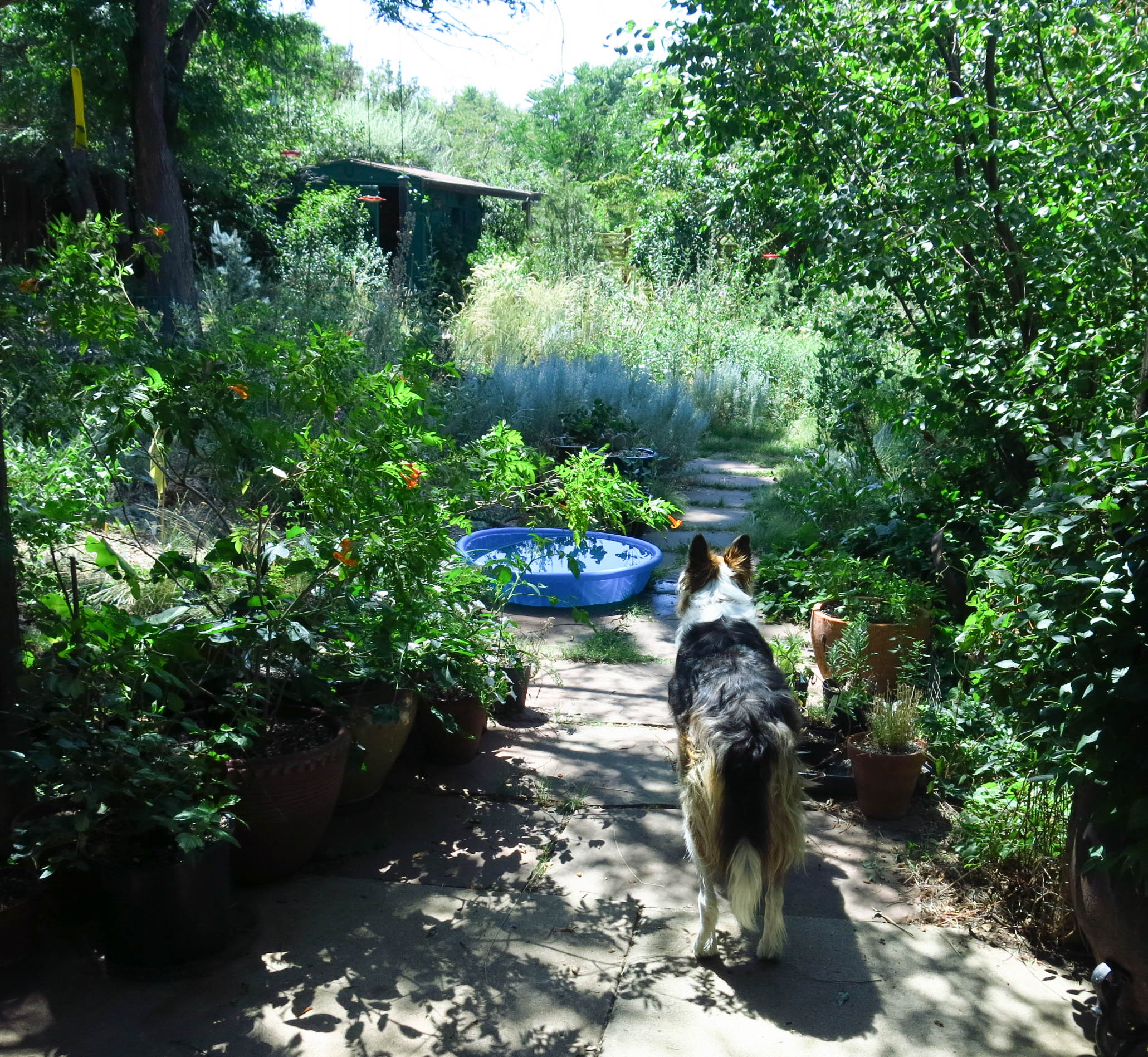 The garden was old by the time the guy I live with first experienced it. The shed had been a garage for a Model A Ford, and had been moved into a corner of the yard, by the “way back” there. The guy I live with loved playing in the shed, though going into the back of it, where stuff had been piled for years, was a bit too scary. But the sight of a line of newly uncovered brick stepping-stones, laid down long before he was born, by people he had only heard of, was one of the most magical experiences of his childhood.